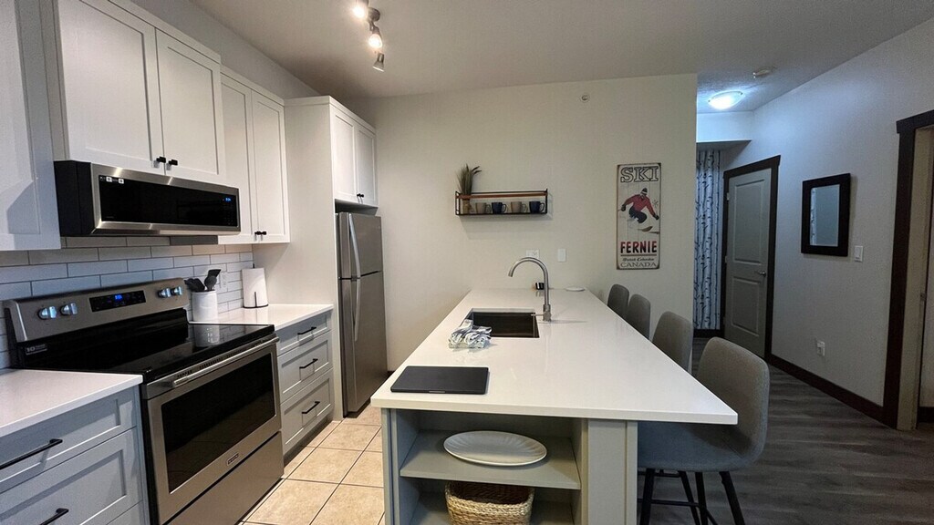 The advertised rate of C$4,540/month is the lowest available price, based on a 30 day(s) stay with a move-in date of May 5, 2026. Rates vary depending on the duration of stay, season, and other parameters. For exact pricing and additional pricing components, please visit our website and enter your desired move-in and move-out dates. The rate is applicable when billed upfront; it can be higher if billed in multiple payments. Enjoy a comfortable stay in this 1-bedroom, 1-bathroom condo at Silver Rock in Fernie. Set on the top floor, this bright and comfortable condo is the perfect Fernie base. Feel at home in this retreat that is ideally located near downtown shops, restaurants, and year-round mountain adventures. The fully equipped kitchen features brand-new appliances, crisp white cabinetry, and clean white countertops. Enjoy casual meals or morning coffee at the kitchen island with seating, stocked with essentials like salt, pepper, oil, and locally roasted coffee beans. A small dining table for two offers a cozy spot for meals. The open-concept living area includes a gas fireplace, a comfortable seating area, and a TV with cable—ideal for relaxing after a day outdoors. Step outside to the private balcony with a natural-gas BBQ, ready year-round. The bedroom features a king-size bed dressed in hotel-quality linens, a ceiling fan, generous closet space, and a large window that fills the room with natural light. The full bathroom offers a tub/shower combination, fluffy towels, locally made soaps, and a hair dryer for added convenience. A stackable in-suite washer and dryer makes longer stays easy and stress-free. This well-appointed retreat offers resort-style amenities including heated underground parking. Please bring your own padlock for the ski locker, or rent one if needed. This condo is ideally located near downtown shops and restaurants. The pool, hot tub, sauna, and steam room area is currently under construction and is expected to be completed by the Spring of 2026. Construction crews will be working Monday to Friday, from 8:00 AM to 4:00 PM, and construction noise is expected during these hours. The hot tub, pool, sauna, steam room and gym are all subject to closures at any time due to various circumstances. If you have any kind of allergy please reach out prior to booking. [SI]