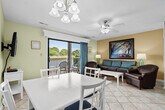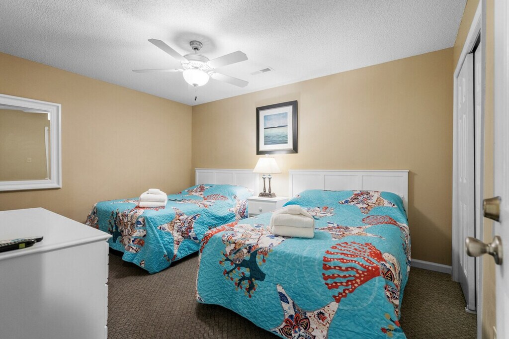 Feel at home in this stylish 2-bedroom ground floor condo, located just 1.5 miles from Surfside Beaches in Grand Palms at Deerfield, offering easy access to the beach and local shopping. This spacious and comfortable condo features a fully stocked eat-in kitchen and a comfortable living room. The primary bedroom includes a king-size bed, a 40" flat screen TV with premium cable, an en suite bathroom, and a walk-in closet. The second bedroom has two comfortable double beds with a separate shower room and vanity/toilet room. Linen service, including linens for all beds, bath towels, hand towels, and wash cloths, is available for an additional fee of $50 for your stay. Enjoy the laid-back, family-friendly atmosphere of Surfside Beach while taking advantage of all the nearby restaurants and beach activities. With a free state parks pass, you'll get daily priority beach access without the hassles of finding parking. The Myrtle Beach State Park (4 miles North) and Huntington Beach State Park (15 mins South) offer a fishing pier, kids playground(s), restrooms, picnic shelters, snack bar, and nature center. Smoking and pets are not allowed as per HOA regulations. Check-in is at 4:00 PM, and check-out is at 10:00 AM. You must be 25 years of age or older to reserve. [SI]