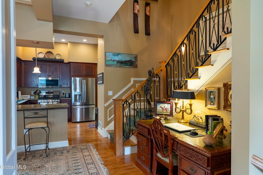 Available from 7/3-9/8 entire race meet. This beautifully appointed 3 story brick rowhouse is within walking distnce to Broadway and only 1 mile to the main gate . There is an open floor plan with hardwood floors throughout the first level. The fully equipped kitchen is open to the main living space and there is a private courtyard with access from the dining area. The primary suite is located on the second floor and features a Queen bed and Tile shower stall. The guest bedroom,also with a queen bed,is located toward the back of the building and has a designated hall bath with tub and shower. The laundry room is also conveniently located on the seconfd floor. On the lower level we find a library and TV/ Home theater room.There is one garage space and additional parking is available on High Rock Avenue. This elegant home is a very special property and is available for rent for the very first time. MLS ID 202615747
