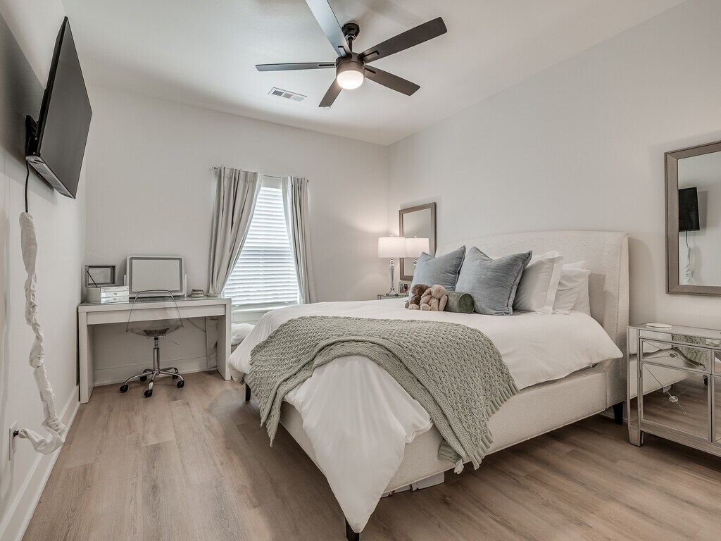 AVAILABLE AUGUST 1ST!!! This brand new 4 bedroom, 4.5 bathroom townhome on N Leverett Ave is one of the best student living options near the University of Arkansas. Each bedroom comes with its own private full bathroom. The open-concept main floor features a spacious living area and a large kitchen loaded with stainless steel appliances, quartz countertops, shaker-style cabinetry, and a gas range. Luxury vinyl plank flooring runs throughout, and every room has a ceiling fan. Dedicated off-street parking right at your front door. Unfurnished so you can make it your own.