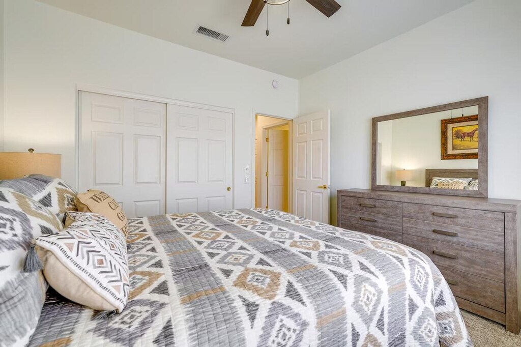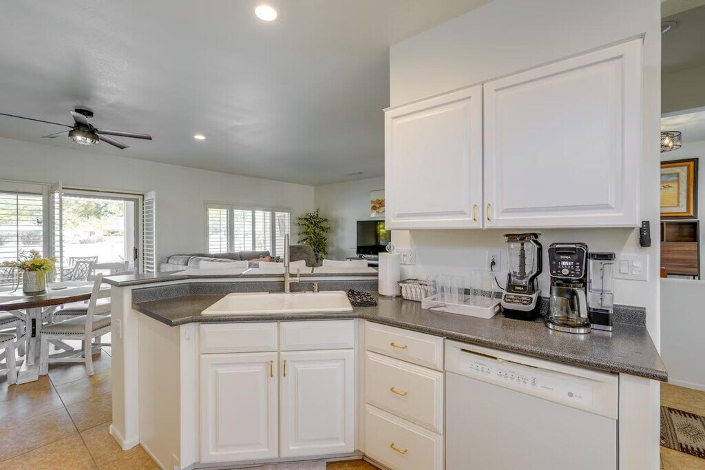 The advertised rate of $6,368/month is the lowest available price, based on a 1 month(s) stay with a move-in date of November 14, 2026. Rates vary depending on the duration of stay, season, and other parameters. For exact pricing and additional pricing components, please visit our website and enter your desired move-in and move-out dates. The rate is applicable when billed upfront; it can be higher if billed in multiple payments. Feel at home in this charming 2-bedroom, 2-bathroom house in sunny Surprise, AZ. This single-story home requires one small step to enter and is located in an age-restricted complex. This tranquil and bright home offers a spacious kitchen, a furnished patio perfect for dining al fresco, a private pool, a covered patio, lounge seating, a flat-screen TV, an outdoor dining area, a gas grill, and a front patio with seating. Inside, you'll find a flat-screen TV, a sectional sofa, 2 dining areas, board games, a printer, ceiling fans, an en-suite bathroom, and a walk-in closet. The kitchen is equipped with a stove/oven, refrigerator, microwave, dishwasher, dishware/flatware, cooking basics, a coffee maker, toaster, and blender. Free Wi-Fi, central air conditioning/heat, towels/linens, a washer/dryer, and a hair dryer are also provided. Guests have access to a golf cart with a signed waiver and bicycles. Community amenities are available for an additional fee, including 4 golf courses, tennis courts, pickleball courts, a basketball court, shuffleboard, a fitness center, painting/pottery classes, and a poker room. A registration fee is required for access to the community amenities: 1-3 month stay ($300/person, 2 renter cards max), 4-6 month stay ($400/person, 2 renter cards max), 7-12 month stay ($600/person, 2 renter cards max), additional cards available with 1/2 payment of annual assessment per card. Parking is available in the driveway for 2 vehicles, with free street parking also available. Tee off at a nearby golf course of your choice or test your luck at Desert Diamond Casino. Smoking, vaping, and the use of tobacco products are prohibited on the property. Pets and parties are not allowed. One guest must be at least 45 years old, and any other guests need to be 19 years old or older. This property features 9 exterior security cameras that are outward facing and do not look into interior spaces. The cameras are activated by motion and will record video and sound while guests are in residence. HOA registration is required. Includes a workstation. [SI]