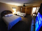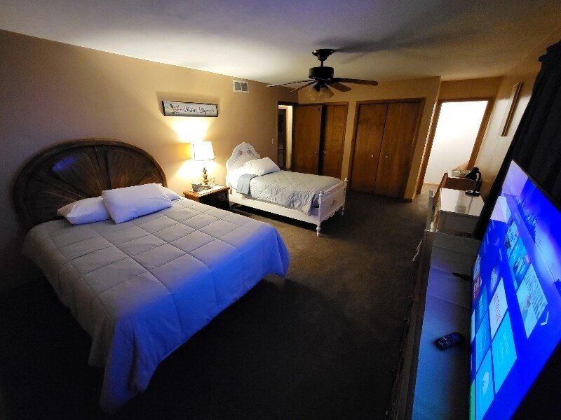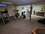 Property Id: 2266066 The home has a main floor, an upstairs and a finished basement. In the basement there is a washer and dryer with laundry supplies, storage, treadmill, and stationary bike. The main floor has a fully equipped eat in kitchen with a small table and chairs, dining room with table and chairs, a half bathroom, as well as comfortable sectional with a 50- inch smart TV . The second floor has two bedrooms and two full bathrooms with showers. The master bedroom has a full attached bathroom w/ stand up shower, King and twin size bed, dedicated workstation and Roku smart TV. The second bedroom has a queen and twin bed, smart TV and room darkening curtains.