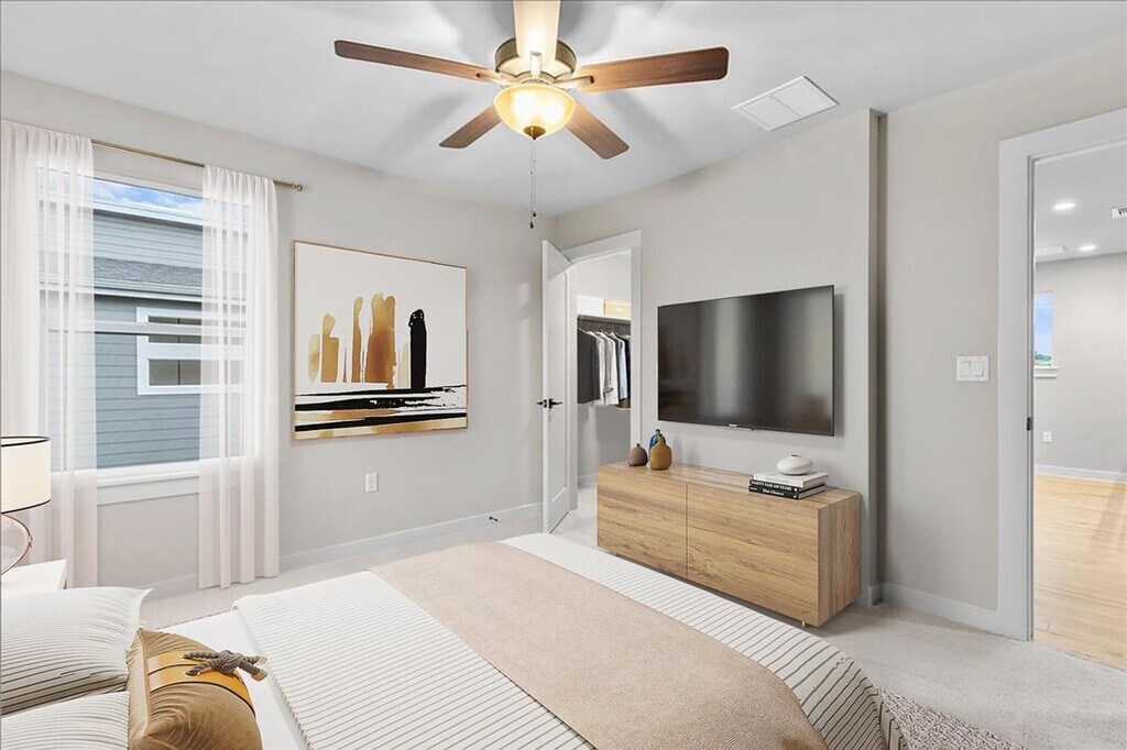 Located just off State Highway 130 – Austin’s 80 mph highway – so getting around is easy. 7 minutes from Tesla’s new Gigafactory, 20 minutes from downtown Austin, 10 minutes from the Dell and Samsung corporate campuses and 10 minutes from Austin-Bergstrom International Airport. And other major employers like Google and Applied Materials are also just a short drive away. Natural light floods the space through two-story windows, illuminating wood tile floors that connect the spacious living room to a kitchen boasting quartz countertops, stainless steel appliances, and a convenient island for effortless meal preparation. A sliding glass door leads to to the covered back patio, perfect for entertaining. The primary bedroom offers a serene view of the backyard, complete with a walk-in closet spacious enough for all your clothing needs. The beautifully designed bathroom features double sinks, elegant gold fixtures, ample storage, and a roomy shower with stunning veined marble. For added privacy, there's a separate water closet. Upstairs, a second living area serves as the perfect spot for relaxation, gaming, or a spacious office. Adjacent to this space are two generously sized bedrooms, each equipped with good-sized closets, one featuring a walk-in closet. A high-quality geothermal heat pump, a Solar PV-System, and a Smart Home technology package. energy efficiency, keeping utility bills low for a comfortable and cost-effective living experience. With over 700 acres of green space, bike, walk or hike along miles of trails. There is a large resort style pool, and a 24 hour fitness center. There are several playgrounds throughout the community as well as an expansive dog park.