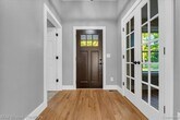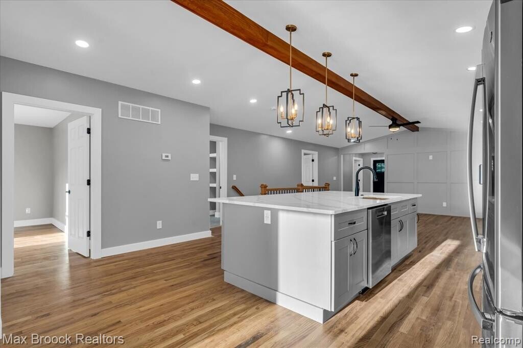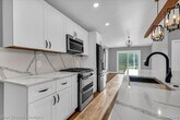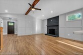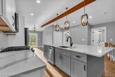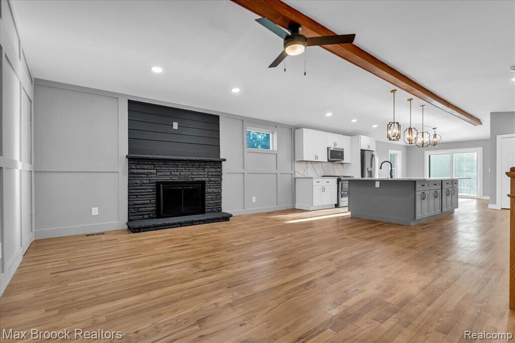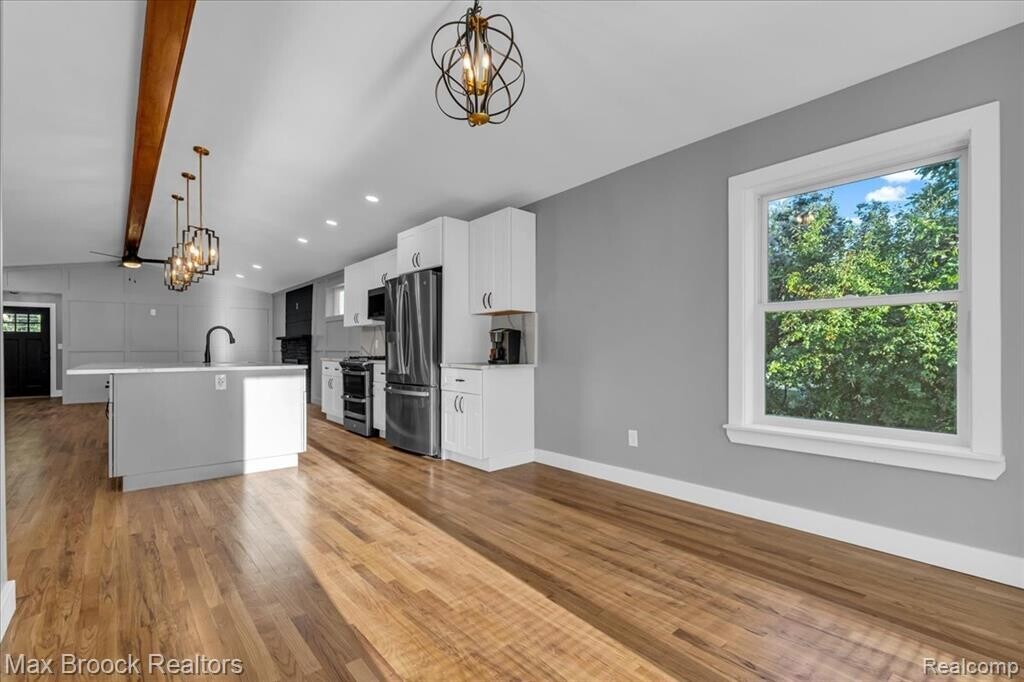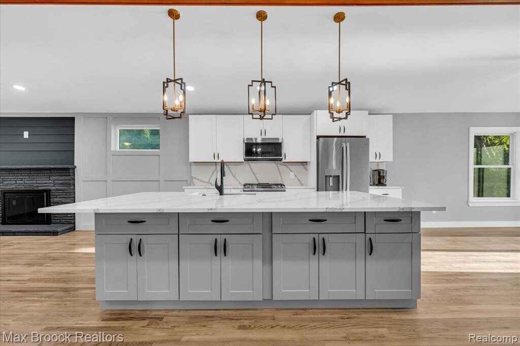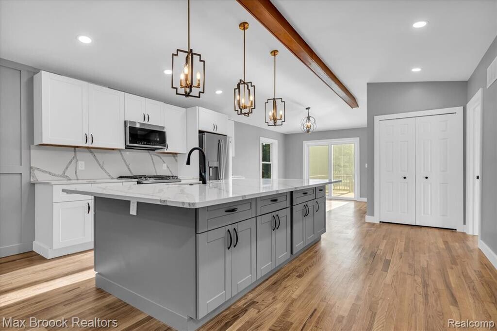 Welcome to your beautifully renovated ranch — completely updated from top to bottom! This stunning raised ranch offers 5 bedrooms, 3 full baths, and over 3,000 square feet of finished living space, perfectly situated on 4.01 acres of peaceful privacy. Step inside and be greeted by an inviting open-concept layout. The spacious living room features a natural fireplace and seamlessly connects to the dining area and chef’s kitchen. Enjoy an oversized quartz island with ample seating, soft-close cabinetry, and abundant storage — perfect for gatherings and everyday living. A front-entry mudroom/laundry area provides convenience, while a stylish office with glass French doors offers the perfect work-from-home setup. The main level includes three generous bedrooms, including a tucked-away bedroom off the living area. Don't miss it! The primary suite features a walk-in closet and a beautifully designed ensuite bath. Red Oak hardwood floors flow throughout the main level, adding warmth and elegance. Great natural light throughout. The finished lower level provides even more living space — ideal for entertaining, a family room, or guest quarters — with two additional bedrooms, a walkout to the backyard, and a second laundry hook-up for added flexibility. Step outside to enjoy the 16x30 cedar deck overlooking your private backyard oasis. Major updates include a roof, HVAC system, A/C, and all-new Anderson windows. This home is truly move-in ready — every detail has been thoughtfully updated for modern comfort and style. BATVAI. Bonus: Lot split available!