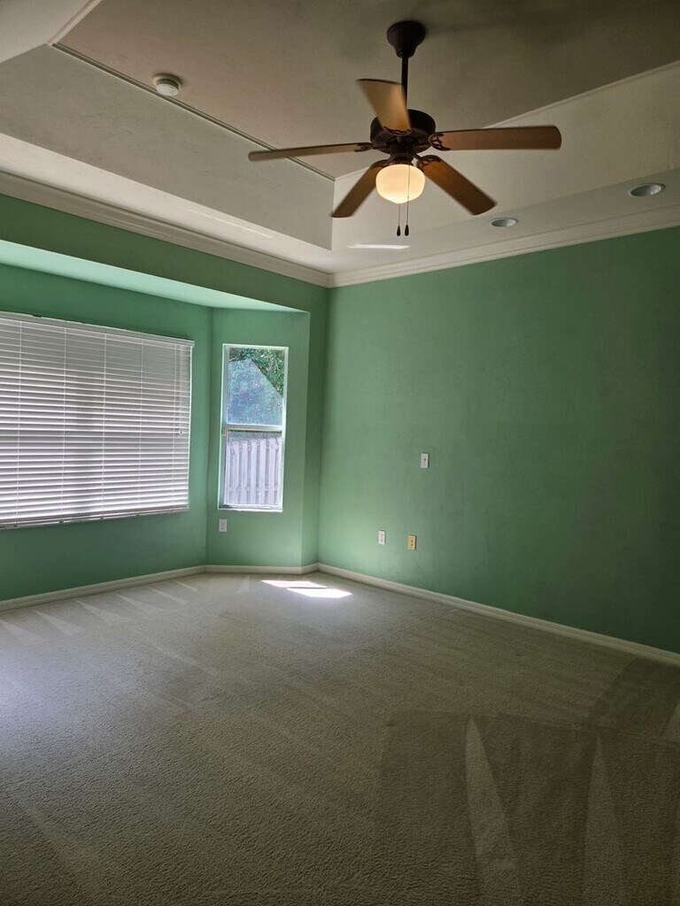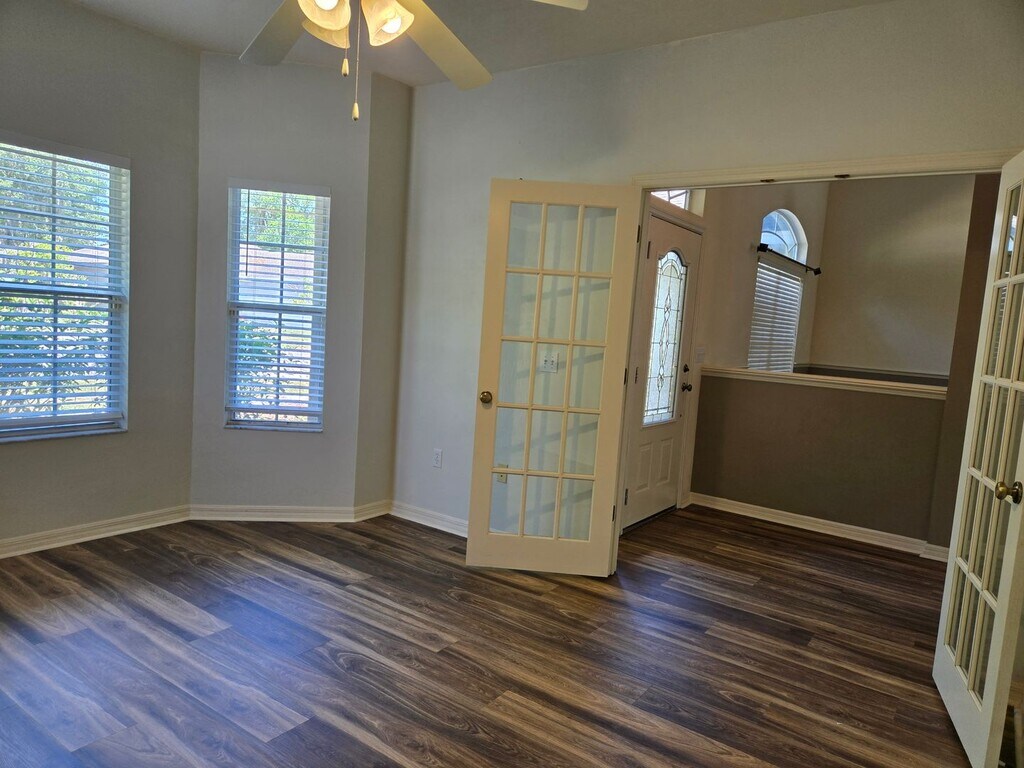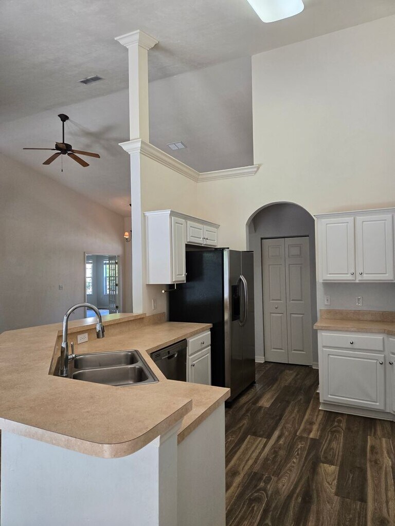 Spacious 4-bedroom, 2-bath home located in the highly desirable Portofino community, featuring a functional split-bedroom floor plan and high ceilings throughout. Bright and open living area along with a separate formal dining room, both enhanced by vaulted ceilings. The main living space features a cozy fireplace and a built-in TV nook, creating a warm and inviting atmosphere. Durable luxury vinyl plank flooring throughout main living spaces. Kitchen offers modern appliances, ample cabinet and counter space, a convenient serving bar, and a built-in desk nook—perfect for staying organized—while seamlessly flowing into the main living areas. Spacious master bedroom features two walk-in closets, along with a private en-suite bathroom complete with dual sinks, a relaxing garden tub, and a separate shower. Three additional bedrooms provide flexibility for guests, a home office, or study space. There is also an additional office area with built-in bookshelves, ideal for working from home. This home offers plenty of storage throughout. The garage has been enclosed and can be utilized as a workshop or hobby space, complete with built-in workstations. Guest bathroom has tub/ shower combo, tiled floors and one sink vanity. Enjoy outdoor living with a spacious screened-in porch overlooking a fenced backyard—perfect for relaxing or entertaining. Inside laundry room with washer and dryer connections only. Residents of Portofino enjoy access to community amenities including a pool, playground, and basketball court. Conveniently located near shopping, dining, and everyday essentials, this home offers the perfect blend of comfort, functionality, and community living. 1 Pet welcome. Pest control included. *please note the icemaker and dispenser do not work* Available: NOW **Residents are enrolled in the Resident Benefits Package (RBP) for $39.95/month which includes renters insurance, HVAC air filter delivery (for applicable properties), credit building to help boost your credit score with timely rent payments, $1M Identity Protection, our best-in-class resident rewards program, and much more! More details upon application. **