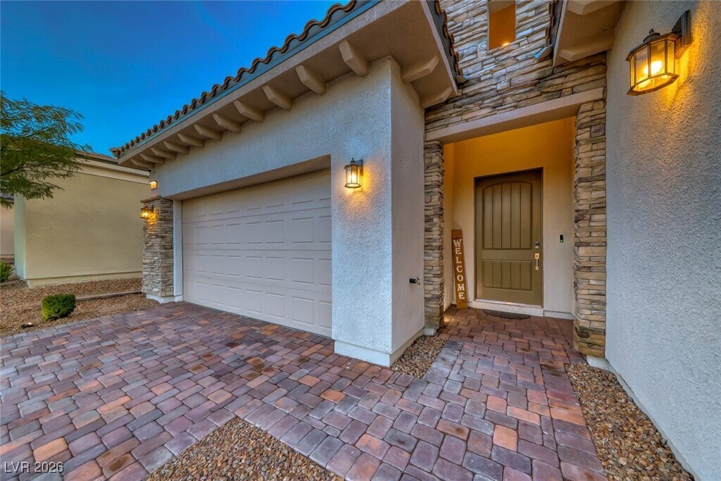 Nestled within the gated Bluffs community at Lake Las Vegas, this 3-bed, 3-bath home offers resort-style living w/ a private pool. Landscaping, pool, & trash services are included, & solar panels provide excellent monthly energy savings. The welcoming floor plan places 2 secondary bedrooms & a hall bath near the front of the home, while the open-concept living area showcases a contemporary kitchen w/ a center island & breakfast bar, 42-inch upper cabinets, stainless steel appliances, a touchscreen refrigerator, & a filtered-water sink. An elegant chandelier highlights the dining area & complements the kitchen’s pendant lighting. The great room features an electric fireplace & opens to the backyard w/ a covered patio, built-in BBQ, & pool w/ Baja lounge. The primary suite is situated at the rear of the home & includes a spacious walk-in closet & a bathroom w/ a walk-in shower. Enjoy the Lake Las Vegas lifestyle in an award-winning master-planned community w/ lake, dining, & events.