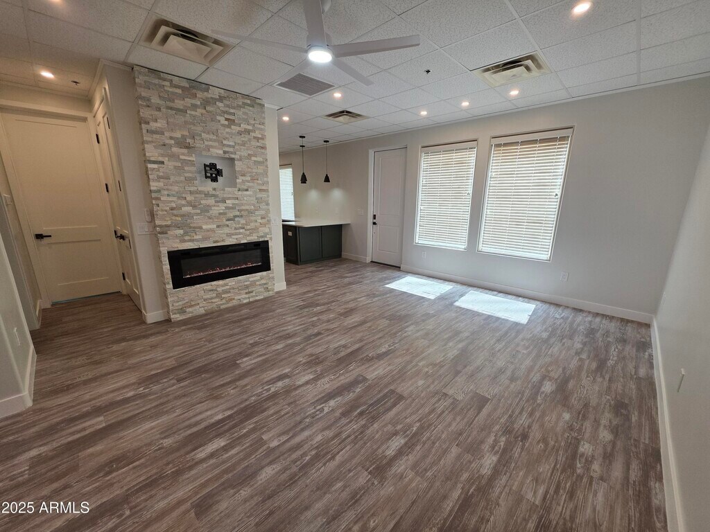 Experience vibrant downtown living in this stylish upstairs condo featuring one bedroom plus a versatile den. The spacious bathroom boasts a walk-in tile shower and double vanity,offering both luxury and functionality. The large kitchen includes an abundance of cabinetry,an electric range,and an eat-at island perfect for casual dining or entertaining. Enjoy the open-concept living area with an electric fireplace that adds warmth and charm. Step out onto the expansive covered east-facing patio and take in stunning mountain and fountain views. This modern condo offers comfort,convenience,and breathtaking scenery all in one package.