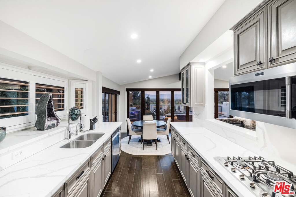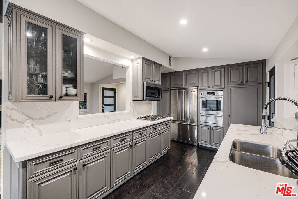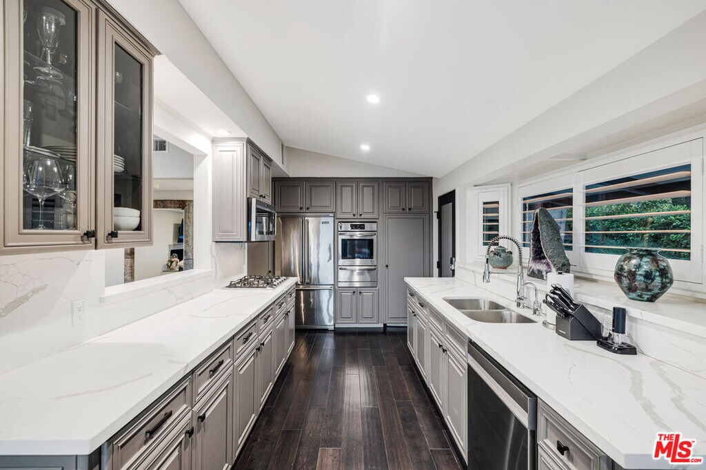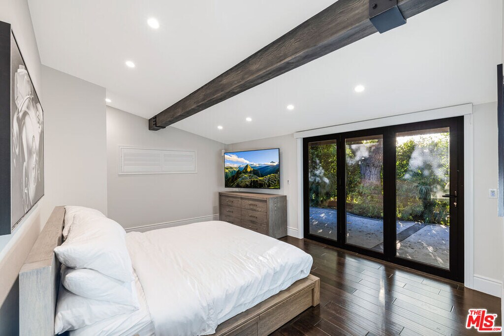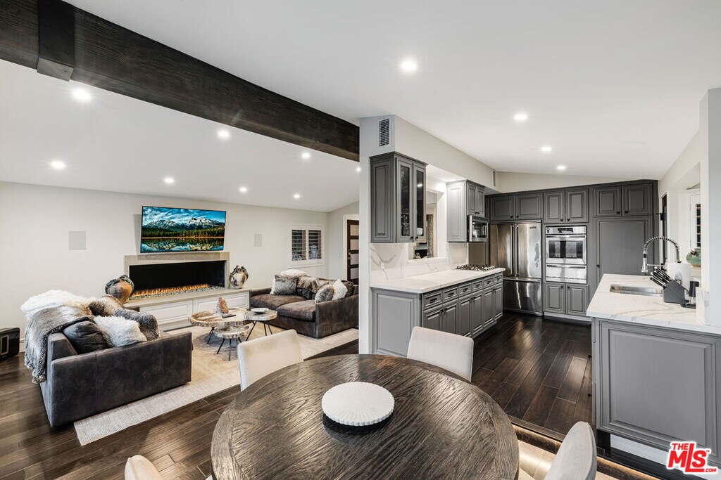 Nestled in the coveted Encino Hills, south of Ventura Blvd, this fully furnished, single-story contemporary retreat blends privacy, modern comfort, and effortless living. Situated at the end of a semi-private driveway and surrounded by mature trees, the home offers tranquil seclusion while remaining just minutes from the vibrant energy of the valley below. An open floor plan connects the living spaces to the backyard, with bi-folding glass doors creating a seamless indoor-outdoor flow. The spacious living room features vaulted ceilings and a fireplace that opens to the dining area and chef's kitchen. Natural light floods the interior, highlighting the rich wood floors and creating a warm, inviting ambiance throughout. The home offers three bedrooms, including a primary suite with a cedar-lined walk-in closet and a beautifully appointed en-suite bath. A versatile bonus room adds flexibility - ideal for a home office, gym, or media lounge. Multiple outdoor areas include a spacious dining patio along with zones for entertaining, a hot tub, and a fire pit - all perfectly positioned for sunset views or stargazing. Recently renovated, the home features updated electrical, plumbing, HVAC systems, and new windows with custom wood shutters, ensuring both efficiency and style. Additional highlights include motorized blackout blinds, a 6 speaker built-in Sonos system that extends into the backyard, motorized skylights, exterior security cameras with a full security system, and high-quality furniture from Arhaus and Restoration Hardware - making this home truly turnkey. Weekly landscaping and spa maintenance is included in the rent along with internet service and an eero mesh wifi network. Conveniently located near top-rated schools, with easy Westside access and proximity to shopping, dining, and Equinox, this hillside oasis offers the perfect balance of luxury, comfort, and convenience. MLS# 25588013