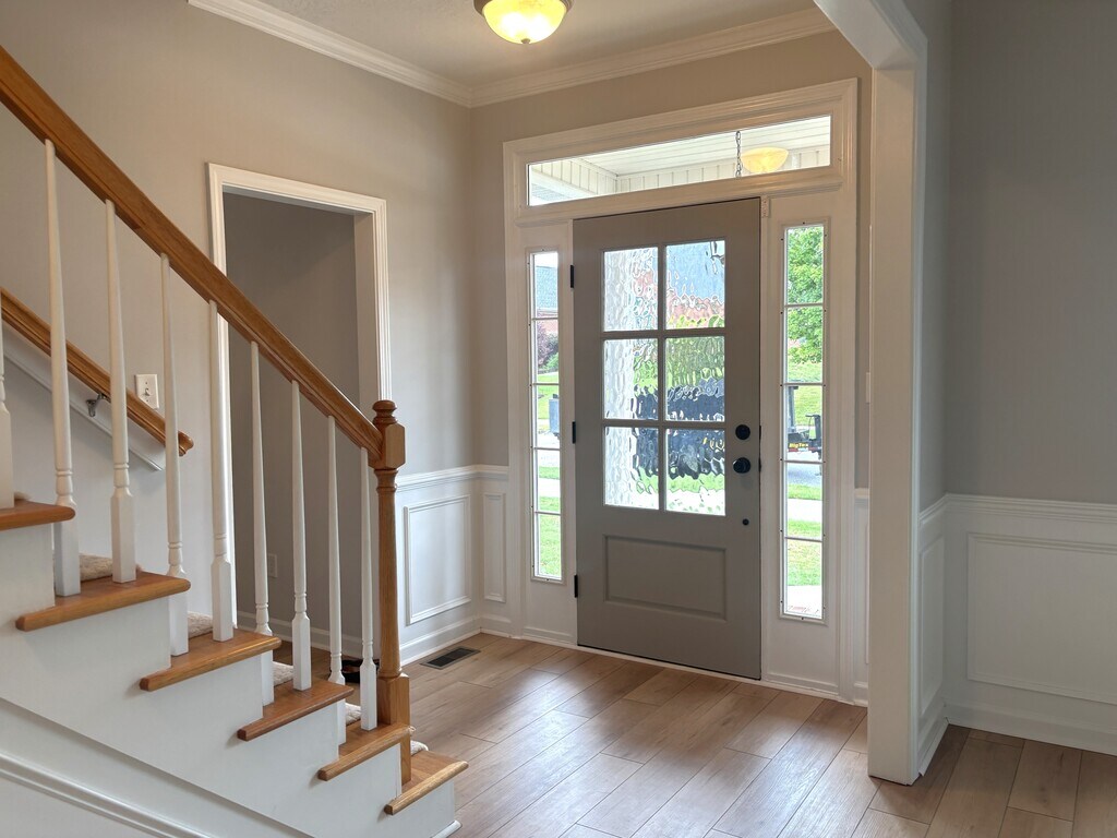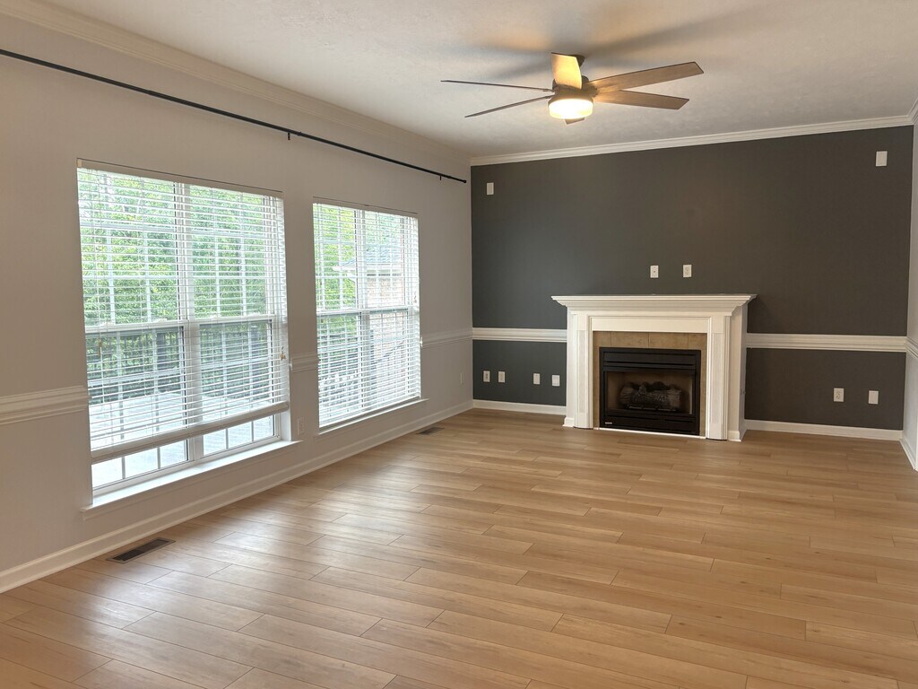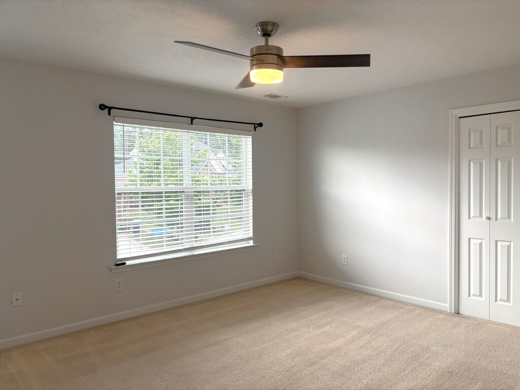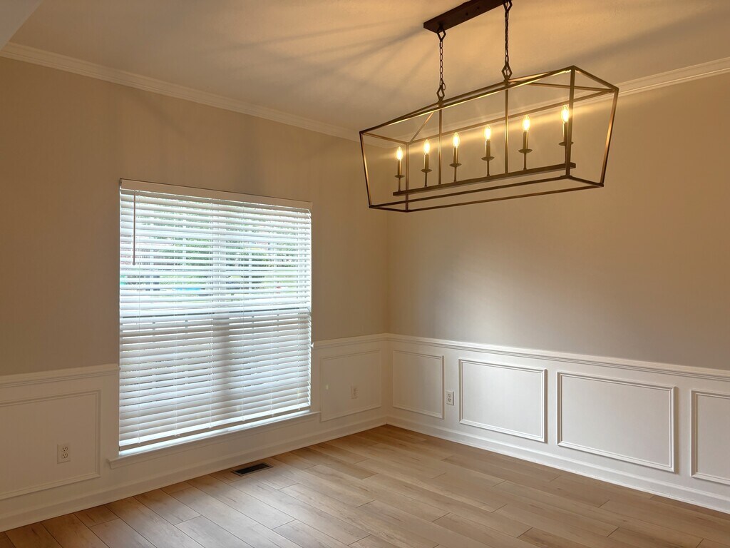 *Special* Discount of $500 off first full month's rent with approved application and move in within 30 days of approved application! Available for immediate occupancy! Available for immediate occupancy! 4 bedroom, 2.5 bath colonial brick home in sought-after Highgrove neighborhood. Covered entrance leads to foyer with coat closet, stairwell and wood flooring, with formal dining room to left and den to the right. Formal dining with decorative lighting and wainscotting with access to half bath and kitchen. Den on the other side of foyer can be used for many purposes, such as formal living room, foyer or children's play room; has decorative lighting, accent wall and double glass doors leading to the great room. The great room has a ceiling fan, chair rail, accent wall and fireplace, as well as plenty of natural light from bank of windows, and is open to the kitchen and breakfast nook. Spacious kitchen with stainless appliances, granite counters, tile backsplash, and breakfast bar at the breakfast nook, which has plenty of natural light and door to rear deck. Laundry room, garage and stairs to unfinished basement are off the kitchen. Upstairs primary bedroom with trey ceiling and fan. Large walk-in closet with plenty of storage space. Large en-suite bath with dual sink vanity and mirror, separate jetted tub and walk-in shower and water closet for privacy. 2nd, 3rd and 4th bedrooms with ceiling fans. 2nd bedroom has access to walk up stairs to the attic. Hall bathroom with dual sink vanity and tub/shower combo located between the bedrooms. Walk out unfinished basement has plenty of room for storage and doors leading to the backyard. Rear deck off breakfast nook with Sunsetter retractable awning for shade, overlooking large backyard.