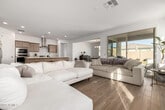 Recent new-build home in close proximity to Village at Prasada,scenic views of White Tank Mountain range & easy accessibility to State Route Loop 303. This single level home feels spacious with its open floor plan,high ceilings & tile throughout. Front foyer entry connected to three guest bedrooms,two guest bathrooms,a laundry room,& a den/study room lending itself to work-at-home opportunities. Great Room adjoins a beautifully appointed wooden cabinetry kitchen with island,granite countertops,& walk-in pantry,a separate dining space,and access to the primary bedroom suite inclusive of water closet,double vanity countertop & walk-in closet. Covered patio overlooks eye-appealing grass backyard with stone border. Large community pool,clubhouse,children's playground,and more!