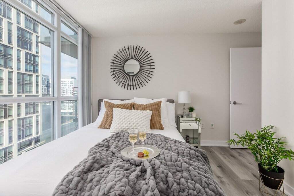Feel at home in this modern apartment on the 12th floor, offering amazing lake views in the heart of the downtown entertainment district. This apartment features 2 bedrooms and 2 bathrooms. This comfortable suite has everything you need. The fully functional kitchen includes tea, coffee, a kettle, a coffeemaker, and a toaster. A washer and dryer are available with supplies. The 2 bathrooms include towels, shampoo, conditioner, body wash, a hair dryer, and other toiletries. Paid underground parking with in/out privileges is available upon request for $20 per night, or $10 per night for bookings of 15 nights or more. A travel crib (for babies 0-18 months) and bed rails are available for $5 per item per night. Pets are allowed for a fee of $10 per pet per night; confirm availability prior to booking. Enjoy easy access to the TTC, Union Station, Lake Shore, and Gardiner Expressway. This apartment is steps away from the CN Tower, Rogers Centre, Union Metro Station, the Financial District, bars, restaurants, Sobeys Grocery Store, and Bishop Airport. According to the condo rules, information about all guests must be provided to the condo management prior to arrival, including names, ID details, and vehicle and license plate numbers (if parking is required). Guests whose names or IDs do not match the information given are not allowed into the building. Guests must be 18 or over to check in. [SI]