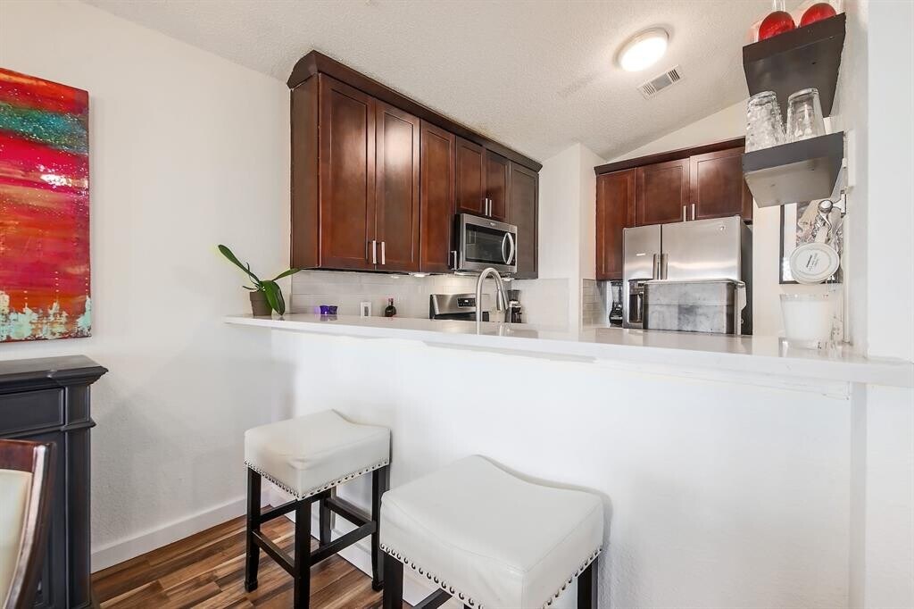 Updated cute 3/2 with laminate flooring and tile (kitchen/baths, entry) throughout-no carpet! Vaulted ceilings in the great room and primary bedroom w/ lots of light. Entertain or relax on the large covered deck. Updated kitchen w/ stainless, quartz counters, breakfast bar, and tall cabinets. The updated master bath includes a walk-in tiled shower and double vanity. 2nd full bath is updated w/ a newly refinished tub. All bedrooms have large closets. Quiet street- NOT a through street. Windermere Park is a 2-minute walk w/ tennis courts, basketball court, playground, picnic tables, and walking/biking trails.A Community Pool is included.
