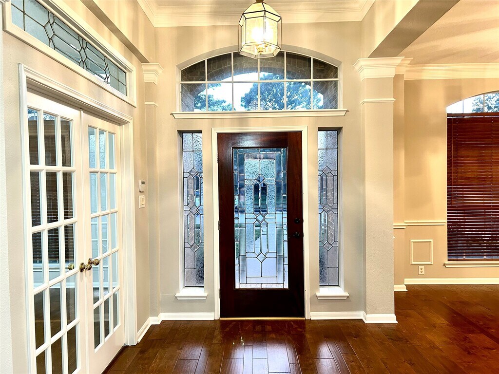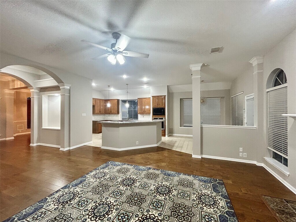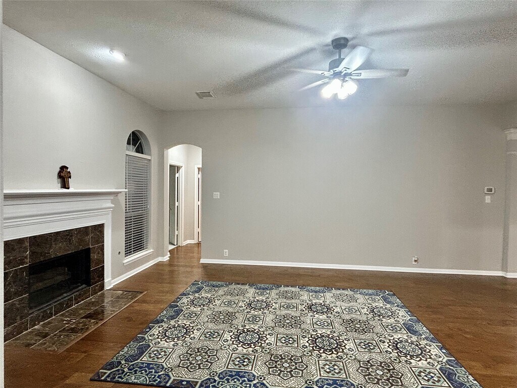 Beautiful and elegant home with excellent curb appeal and a covered front porch. Formal entry features arches,art niche,and updated wood/tile flooring throughout—no carpet. Fresh interior paint. Study/library with double French doors. Flexible front room can serve as a formal living or dining area. Open main living space includes a kitchen connected to the breakfast area and overlooking the family room,highlighted by a striking central fireplace and abundant natural light. Split floor plan with a private primary suite at the back of the home,complete with a sitting area and its own fireplace. Secondary bedrooms are located at the front,along with two additional full bathrooms. Large backyard with brick patio and plenty of green space for outdoor enjoyment. Measurements are approximate; tenants to verify. NO SMOKING,NO PETS,NO SECTION 8 ALLOWED. MLS# 60459895