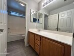 Move in Special $500 off your first full month of rent!! The gourmet kitchen is a chef's delightstainless steel appliances,sleek granite countertops,& an island. Downstairs half bath & laundry room w/*NEW* wood flooring. Washer & *NEW* dryer included. Primary suite w/*NEW* plush carpet,walk-in closet & an ensuite bath w/ *NEW* wood plank flooring,dual sinks,separate toilet room & a separate shower & soaking tub. 3 additional bedrooms with *NEW* plush carpet share a guest bath with *NEW* wood flooring! Step outside to your resort-style backyard,complete with a sparkling pool (pool services included),covered patio,& desert landscaping. Home is friendly to a max of 2 spayed/neutered pets with $550 per pet fee. $50 non-ref app fee per person 18+