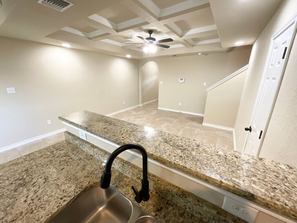 Experience comfort and style just minutes from Retama Park. The living room features a stunning coffered ceiling, crown molding, and recessed lighting that continue throughout the first level. The kitchen boasts sleek granite countertops, all-black appliances, and a convenient breakfast bar. Just add stools to create the perfect gathering spot. Enjoy abundant natural light and extra storage under the stairs. The backyard offers a large shade tree, a privacy fence, and peaceful views of the open field beyond, ideal for relaxing outdoors. Ceramic tile flooring enhances the lower level and all bathrooms. You'll love the convenient location near Randolph AFB, Ft. Sam, and BAMC, with easy access to Loop 1604 and I-35. Great shopping, dining, and entertainment options await at The Forum and nearby areas.