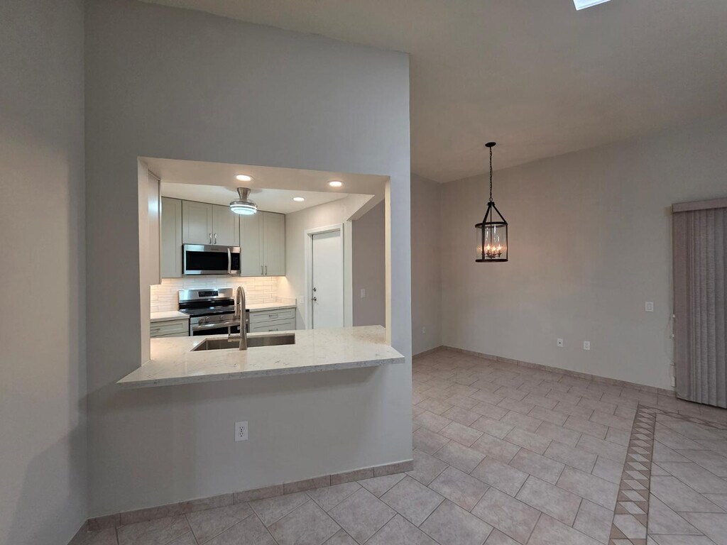 New Appliances and Newly Remodeled Modern Kitchen with Quartz Countertops with Large One Bedroom,One Bath,One Car Garage,with Patio,about 900 Square Feet with Dining/Living 10-foot Ceilings with Skylights. 55+ only Community with discounted recreation fees available for renters,that include Pools,Spas,Picnic areas,Bocce Courts,sports facilities like Bowling,Shuffle Courts,Gym,and extensive choice for clubs,like Ceramics,Various Art Clubs,Jewelry Making,and too many to list! Garage with interior Laundry MLS ID 7019731