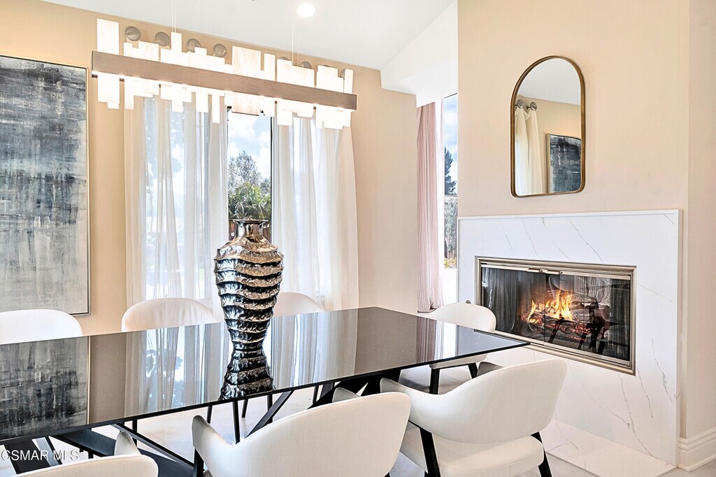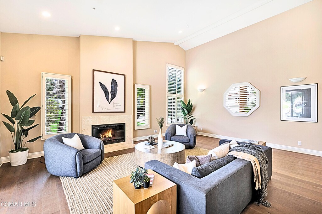 Welcome to North Ranch Estates! Located behind the North Ranch Country Club and Golf Course, this amazing property is one of only 16 behind the gates of this exclusive Westlake Village development. The entry is grand - vaulted ceilings, updated architecture, and an abundance of natural light greet you as you enter. The floor plan is open and inviting. All ceilings are high and the house was designed with a very updated look. The living room opens to the dining room - they are connected in the center by a two sided marble fireplace. The elegant 48''x48'', newly installed, porcelain floor tiles add the perfect touch. The kitchen and family room are spacious - both open to the backyard for dining and entertaining. The kitchen features newer counters, updated cabinetry, stainless steel appliances, a built in refrigerator, and three large pantries - one is big enough to use as an office, wine room, etc. The generously sized family room features a fireplace and an abundance of windows, showing off the beauty of the outdoors. The home has four bedrooms: there are eight steps up to the primary suite with a cozy fireplace, spa-like bath area and an enormous and well laid out walk in closet. In addition to the primary suite, there are two junior suites on this level. The fourth junior suite is a walk-out suite located on the lower level which is eight steps down from the homes' entry level. The junior suite opens to the spacious backyard and pool area. In addition to the large closet in this bedroom, you'll find two more closets conveniently located across the hall. There is also an outdoor area on this level that can be used as a dedicated workout space, reading area, meditation zone, yoga spot, etc! The property is almost 2/3 of an acre - the backyard features a very large grassy area as well as a PebbleTec spa and pool with water feature. There is an outdoor dining area off the kitchen and an outdoor lounge area adjacent to the family room. The backyard is lush and private.The oversized 3 car garage, cul de sac location, beautiful curb appeal AND the fact that it's adjacent to the North Ranch Country Club round out the desirability of this rare offering!