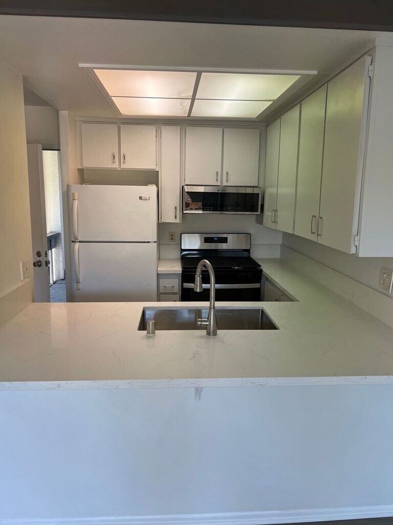This is an upper studio condo around 470 square feet with a full kitchen including fridge, stainless steel dishwasher, stainless steel gas range with overhead stainless steel microwave and lots of cabinet and drawers. It has vaulted ceilings, a large balcony, and a step down room with a fireplace. Large bathroom with closet. An additional closet near main living room provides extra storage space. New wood plank flooring. Community pool and harbor access. Features: -Walk to the Beach -Fireplace -Breakfast Bar Eating Area -Quartz Countertops in Kitchen -Wood plank flooring throughout -Balcony -Vaulted Ceilings -Community Pool, Jacuzzi, and BBQs -1 Carport Space -Private Access to Huntington Harbor The owner is requiring renters insurance at move-in. The application process is found through our website Please fill out the application and provide the necessary information asked. It is processed by a third party, Intellirent. There is a $40 application fee for each individual over the age of 18.