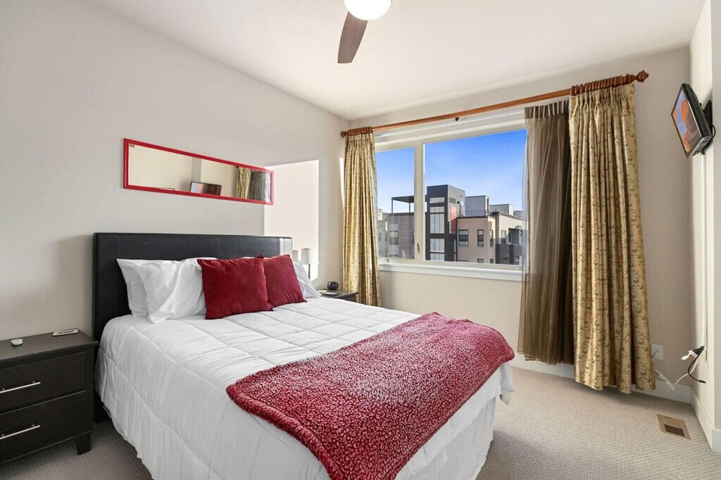 This two-bedroom home spans approximately 1,790 finished square feet on four levels, featuring a generously-sized front porch and an attached single-car garage. The second level's open floor plan encompasses a living room with a signature gas fireplace, a kitchen with bar seating and an entertainment island, a powder room, and a dining area with a walkout deck, making you feel at home. The third level of this apartment houses two bedrooms, both with large windows, two bathrooms, and a laundry. The fourth level boasts a huge rooftop terrace with stunning views of the city and Sloans Lake, providing a perfect setting for relaxation or entertainment. The property is ideally situated to offer stunning views and a comfortable living environment. The neighborhood's walkability allows for easy access to nearby amenities, ensuring a convenient lifestyle. Any supplies beyond the initial welcome packet are up to the guest to replenish as we do not restock these items. This is an industry-standard practice. Cleaning supplies are not stocked due to safety issues. [SI]