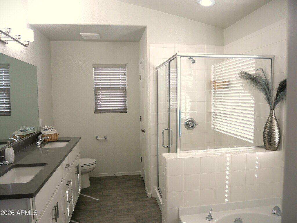 This stunning house boasts 4 spacious bedrooms and 2 full bathrooms,offering ample space for comfort and relaxation. The home's vaulted ceilings and tile flooring in active areas create an open,airy atmosphere. While the walk-in shower and garden tub provide a spa-like experience. The kitchen is equipped with a stainless steel refrigerator,gas range,dishwasher,and built-in microwave. The quartz countertops and White Maple cabinets add a touch of elegance and durability. The primary bathroom features rectangle dual sinks for convenience,and the walk-in closet offers plenty of storage space. The 2.5 car garage provides additional storage or workspace. The enclosed backyard. Covered patio is perfect for outdoor entertaining or simply enjoying the Arizona sunshine.