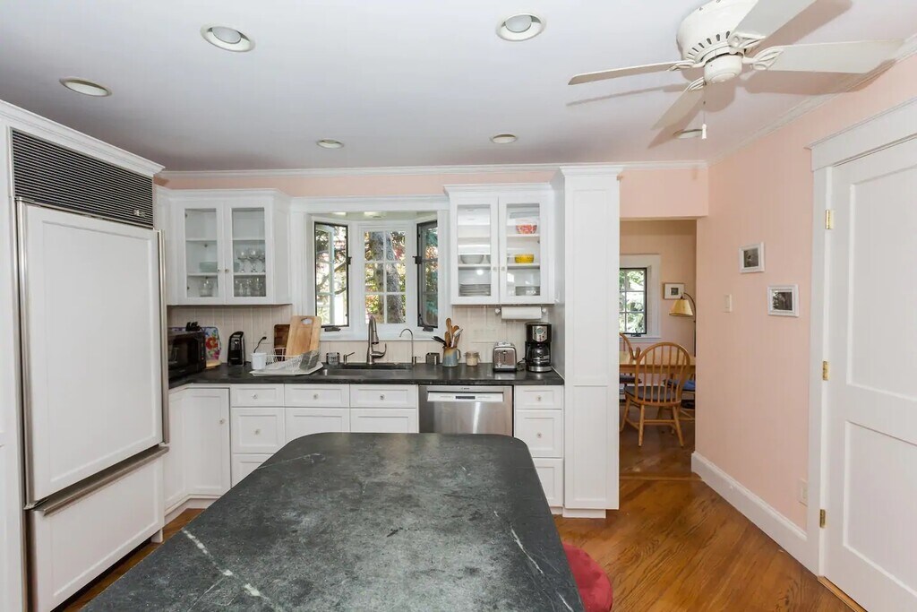 Enjoy the convenience of the city in a picturesque Brookline Village neighborhood, in your own private home. The sunny home is located on an urban, quiet residential cul-de-sac in a quaint area of Brookline, with a lovely park block away. The home comes fully equipped with soapstone counters, a Viking stove, a Sub Zero refrigerator, hardwood floors, central air conditioning, three bedrooms (plus an in-law suite on the ground level), three full bathrooms, and two parking spaces. Brookline Village shops and restaurants are just a three-minute walk. The space Upon entrance, the home features a spacious living and dining area, sunny outdoor deck, modern eat in kitchen, full bathroom, and separate dining room. Upstairs, you will find three bedrooms and a full bathroom off the hallway. The finished basement, which can be used as an in-law suite, office, or playroom. There also is a washer and dryer. There is a full bath on the ground level. Parking is available directly in front of the house for two cars. The house is conveniently located moments away from both the D and E MBTA lines, several bus lines, two Hubway stations (Boston's bike-sharing system), and a Zipcar port. The house is also walking distance to many fantastic Brookline area restaurants, Longwood Medical Center, and most of Boston's famous hospitals. The house is only a 10-minute drive from many of the area's wonderful universities, including Boston College, Northeastern, Simmons, and many more. Brookline Village retains the feeling of a traditional village in countless ways a neighborly center where store owners know each other and most of their customers by name. The Village prides itself on being a small, eclectic blend of old and new. Storefronts are tasteful and harmonious.