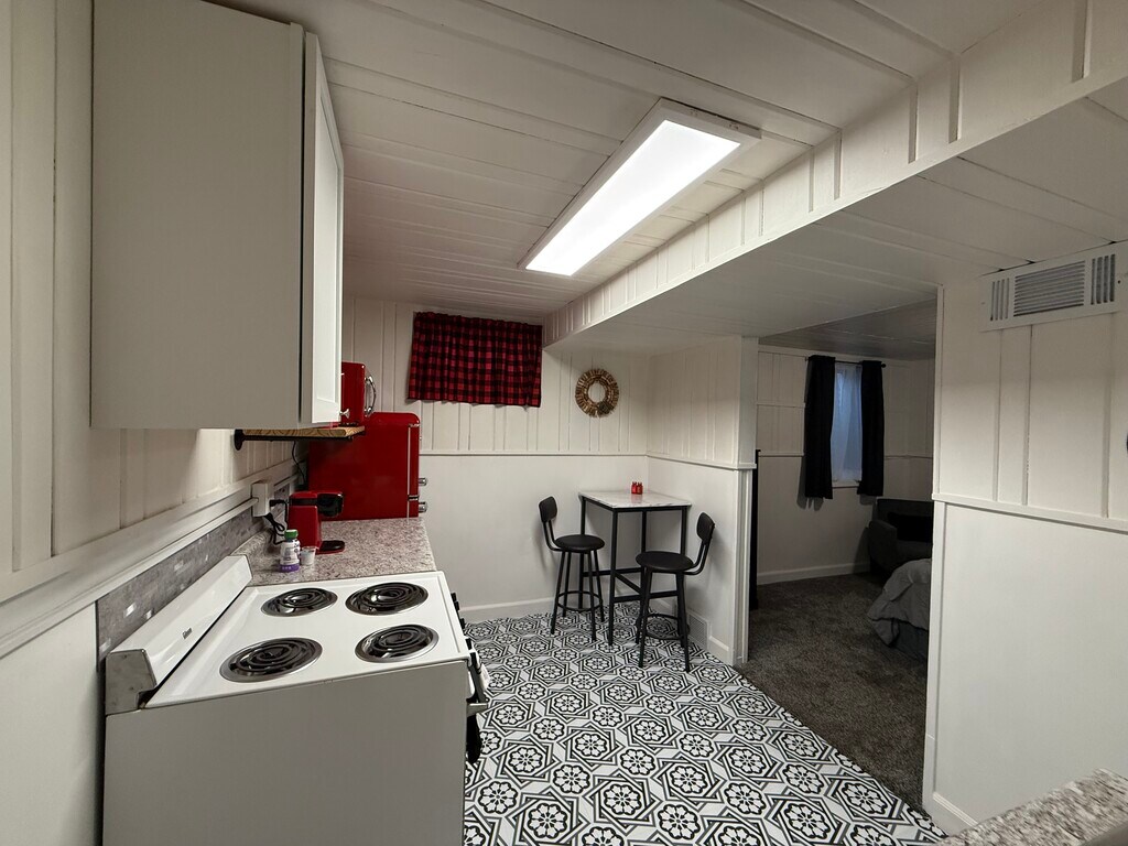 Basement unit newly remodeled studio apartment. All utilities paid, including internet. There is coin operated laundry on-site and dedicated off street parking.