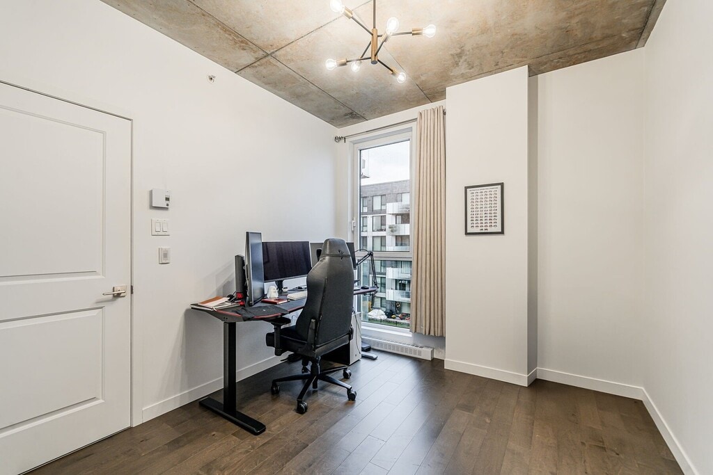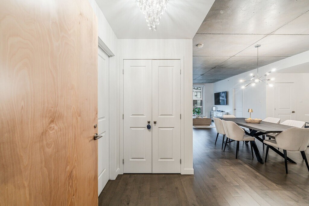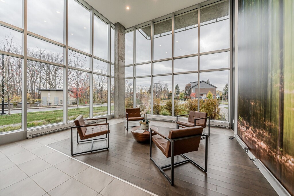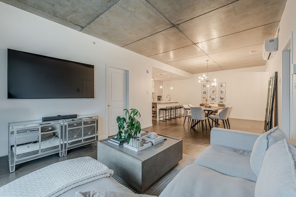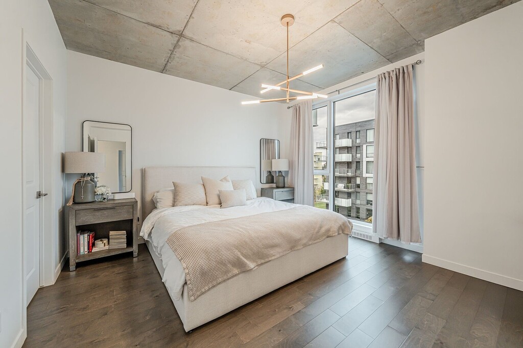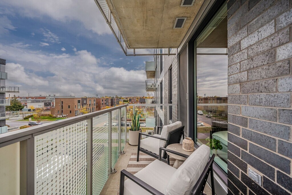 Beautiful apartment for rent in Pointe-Claire's Greenwich neighbourhood. This modern condo offers two (2) bedrooms and two (2) bathrooms, an indoor parking space, and a storage area. You'll appreciate the 9-foot concrete ceilings and generous floor-to-ceiling windows that fill the space with natural light. The contemporary kitchen, with a central island, opens onto a welcoming living area, perfect for entertaining or relaxing. The building features two heated pools with landscaped terraces, a gym, and bicycle storage. Conveniently located near shops, services, public transportation, and the future REM station.