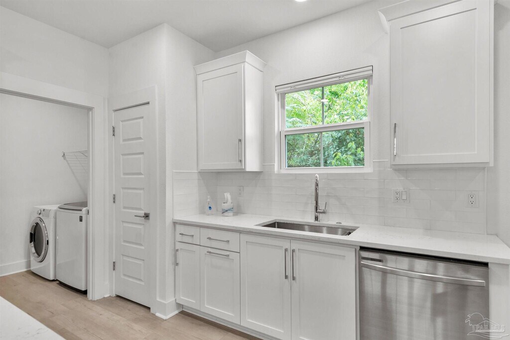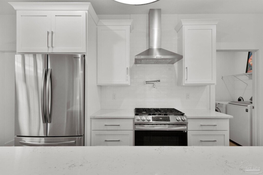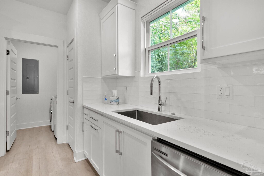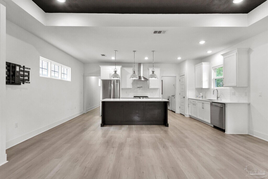 This beautifully designed 3-bedroom,2-bathroom home offers 1,610 square feet of stylish living space,high-speed internet,and a location that’s hard to beat! Just minutes from downtown Pensacola,you’ll enjoy quick access to local restaurants,bars,Blue Wahoos Stadium,shopping,and entertainment — all while coming home to comfort and privacy. Step inside and immediately notice the soaring ceilings,luxury vinyl plank flooring,and designer light fixtures that give this home a modern,elevated feel. The open-concept layout creates the perfect flow for both everyday living and entertaining. The kitchen is a standout with custom cabinetry,natural stone countertops,stainless steel appliances,and plenty of prep and storage space. Just off the kitchen,you’ll find a spacious laundry room complete with a washer and dryer included for tenant use (but not warranted),along with additional room for storage. Both guest bedrooms are well-sized and offer comfortable space for rest,work,or organization. The oversized primary suite is a true retreat,featuring plenty of room for furniture and storage,plus a separate bonus area with a door — perfect for a home office,reading nook,nursery,or extra storage space. Out back,enjoy a covered porch that’s ideal for morning coffee or evening unwinding,along with a privacy-fenced backyard that’s perfect for relaxing,entertaining,or letting your pup enjoy the outdoors.
