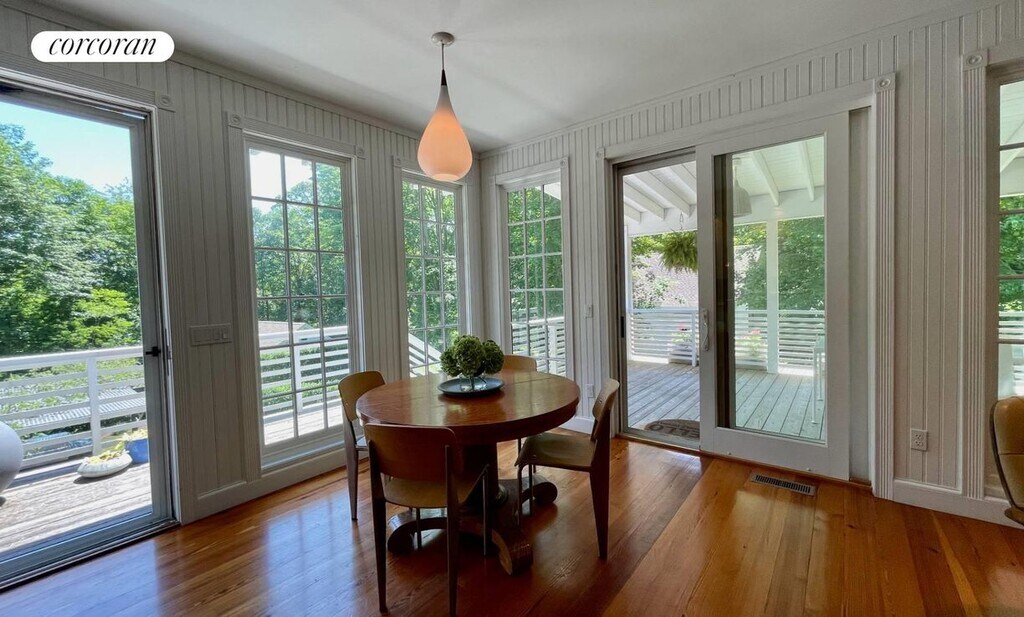Located within close proximity to popular Sunset Beach, golf, tennis and Perlman Music Camp in desirable resort area, this hand-crafted Scandinavian style farmhouse with summer guest cottage and barn with loft on 1.5 acres was thoughtfully built and completed in 2010 using rich textures and environmentally efficient amenities. Pine and cedar aromas fill the air inside this beautifully sunlit home, with 200 year old reclaimed heart pine floors throughout the main level. The living room, which has doors to an airy Finnish slatted style entertainment veranda, also offers a Scana wood burning stove with slate surround. Adjacent is a modern kitchen with lacquer style cabinets, jade Caesarstone counters and penny-tile surround. Two bedrooms and a full bath overlook fruit trees for a tranquil scenic view. The master suite has large windows that look up into a treed canopy and a spacious bath with separate tub and shower. The lower level is presently wide open with a wall of french doors to the pool courtyard. An adorable 2 bedroom, 1 bath summer cottage with cathedral ceilings and full kitchen is just beyond the lawn, with its own dedicated grounds and outdoor shower. A fabulous barn is available for kayaks/boat. Hip with historic references, and in tune with life surrounded by nature, this farm compound is ready for you and your summer guests. Square footage above does not reflect SF in cottage which is 720 sf. [[Rental Registration # 2025-L-0162]]