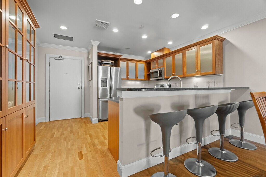 Call for Availability - Literally steps from some of Mystic's most popular eating establishments: The Oyster Club, The Treehouse, Sift Bake Shop and other unique restaurants. The living is easy in this upscale and beautifully renovated one bedroom condo in a limited access, elevator-serviced historic luxury building located on the Mystic River. Private Deck for Grilling and Entertaining Outdoors. Feeling Nautical? Take a lawn chair out to the beautiful shared front lawn and watch all the river traffic go by. Condo boasts hardwood floors, granite counters, floor to ceiling slate gas fireplace, upscale kitchen appliances including a French-door refrigerator, carpeted bedroom and ample closet space. Washer and dryer in walk-in Pantry Closet. All that Mystic has to offer is in within your reach! MLS# 24130551