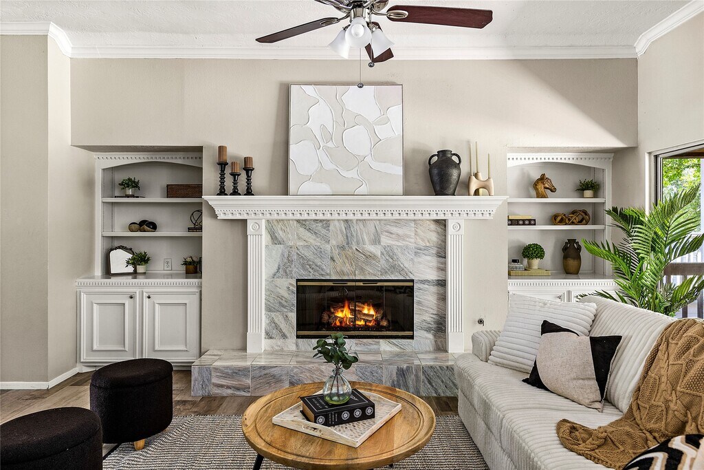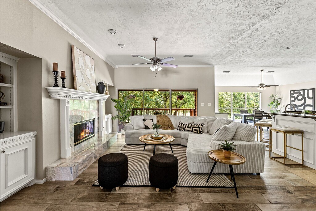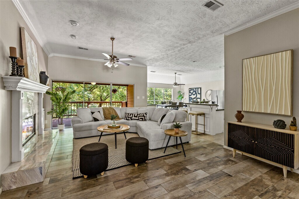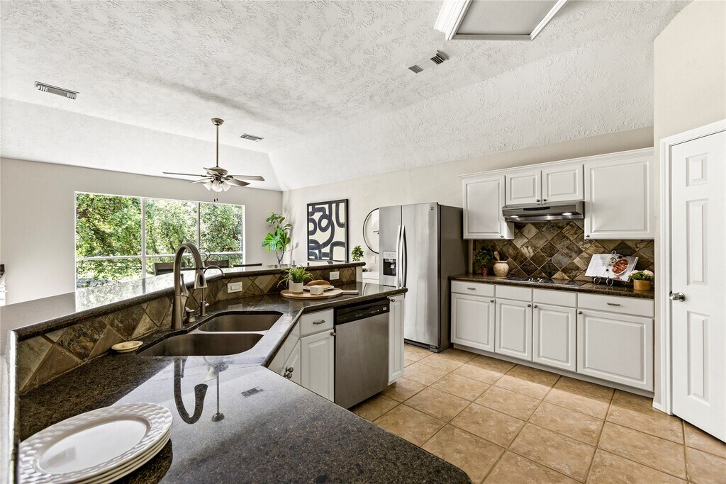 Exquisitely updated golf course home in the prestigious April Sound Country Club,perfectly positioned on Hole #11 of the Blue Course. Walls of windows frame serene,tree-lined views,creating the ambiance of a private retreat. The second-floor living area and primary suite feature elegant wood-look tile,a stylish wet bar,and access to an expansive covered patio ideal for entertaining. Downstairs offers two additional bedrooms,a versatile study or fourth bedroom,and another spacious covered patio. Recent updates include a new AC unit,granite countertops,and modern stainless-steel appliances. Experience refined golf course living where luxury,comfort,and tranquility meet. MLS# 55303871
