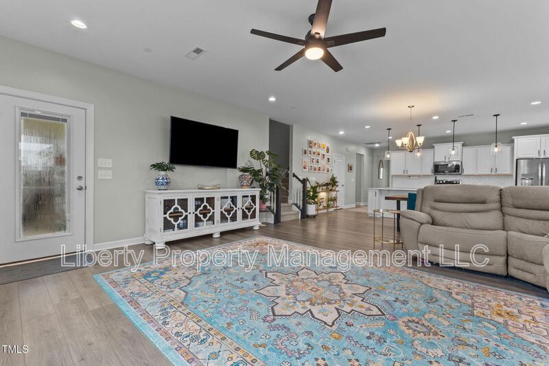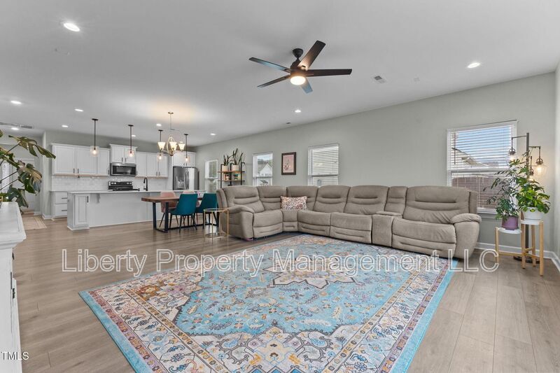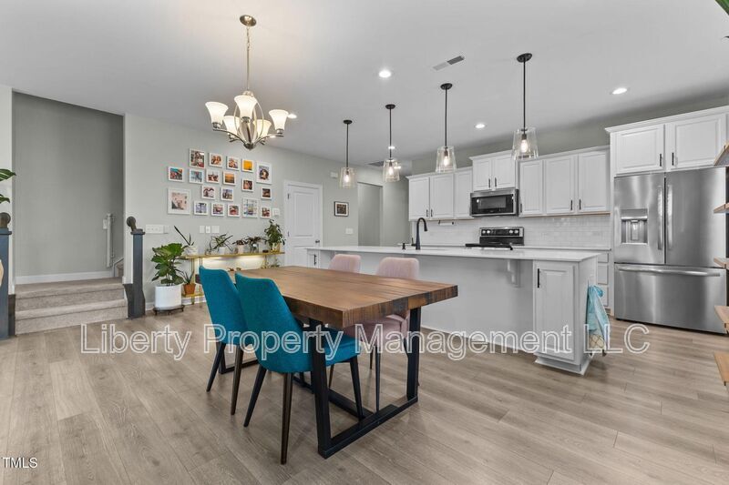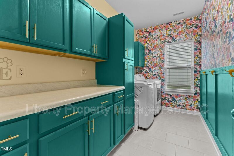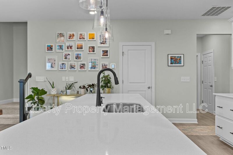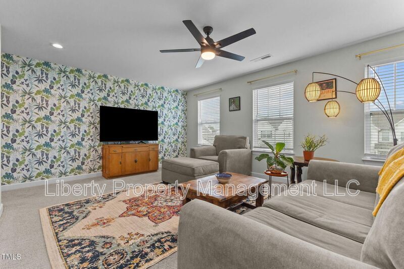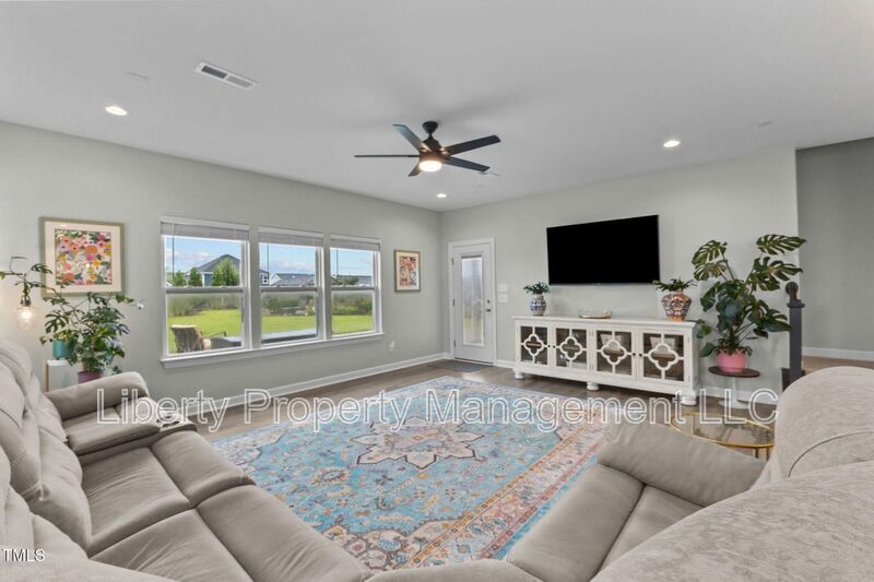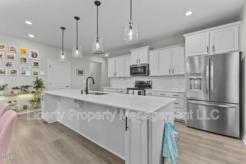 This like-new, stunning 4-bedroom, 3-bathroom home offers nearly 2,900 square feet of beautifully designed living space and custom upgrades throughout. From the moment you arrive, you'll be welcomed by lush, professionally landscaped front and backyards that create a serene atmosphere. Inside, the gourmet kitchen features an oversized island with additional storage, modern light fixtures, sleek black hardware, and stainless-steel appliances. The kitchen overlooks the spacious living room, making it perfect for entertaining, and luxury vinyl plank flooring flows within first floor main areas. The primary suite is located downstairs and includes a spacious ensuite with an oversized walk-in shower and dual vanity sinks. Tasteful pops of color and stylish accent walls throughout the home give it a unique and elevated design. The laundry room and spare bath have been thoughtfully modernized with beautifully painted cabinetry, designer wallpaper, and includes a washer and dryer for added convenience. Upstairs, you'll find three generously sized bedrooms with ample closet space and a large loft that offers endless possibilities as a second living area, office, or playroom. Outside the living room windows there are views of the gorgeous backyard, which features custom landscaping, sitting area, an enclosed back patio for year-round comfort, and an expanded concrete extension ideal for a grill or play area. A two-car garage completes this pristine and move-in-ready home. This exceptional rental is available now—schedule your private tour today!