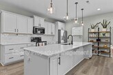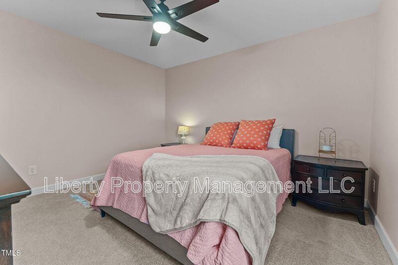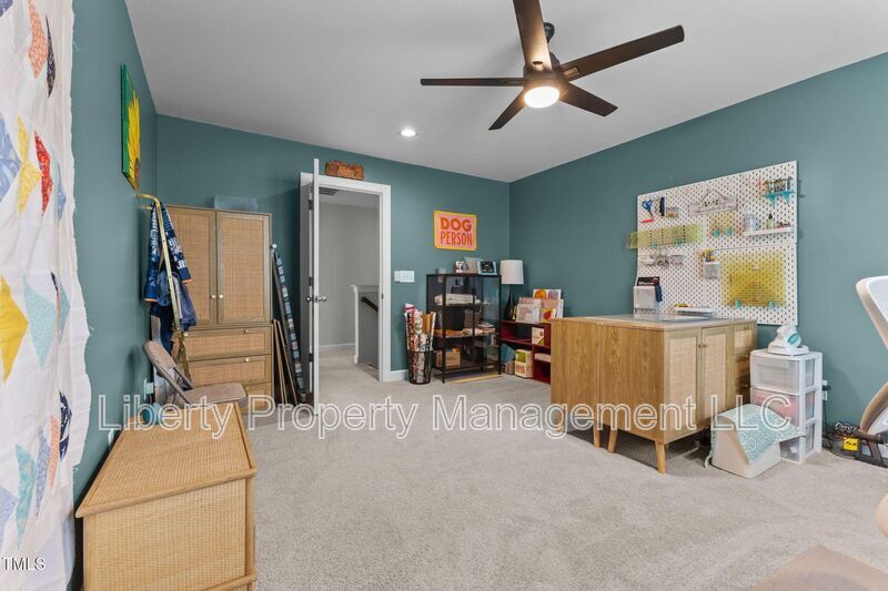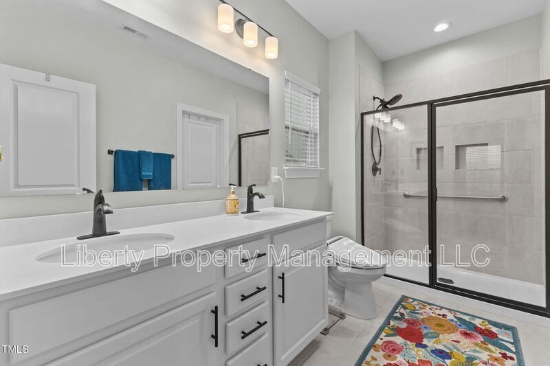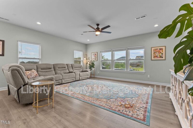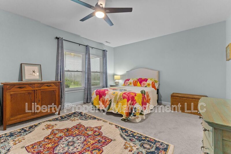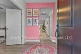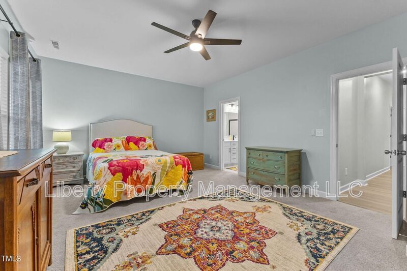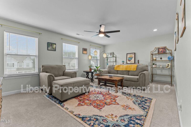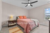 This like-new, stunning 4-bedroom, 3-bathroom home offers nearly 2,900 square feet of beautifully designed living space and custom upgrades throughout. From the moment you arrive, you'll be welcomed by lush, professionally landscaped front and backyards that create a serene atmosphere. Inside, the gourmet kitchen features an oversized island with additional storage, modern light fixtures, sleek black hardware, and stainless-steel appliances. The kitchen overlooks the spacious living room, making it perfect for entertaining, and luxury vinyl plank flooring flows within first floor main areas. The primary suite is located downstairs and includes a spacious ensuite with an oversized walk-in shower and dual vanity sinks. Tasteful pops of color and stylish accent walls throughout the home give it a unique and elevated design. The laundry room and spare bath have been thoughtfully modernized with beautifully painted cabinetry, designer wallpaper, and includes a washer and dryer for added convenience. Upstairs, you'll find three generously sized bedrooms with ample closet space and a large loft that offers endless possibilities as a second living area, office, or playroom. Outside the living room windows there are views of the gorgeous backyard, which features custom landscaping, sitting area, an enclosed back patio for year-round comfort, and an expanded concrete extension ideal for a grill or play area. A two-car garage completes this pristine and move-in-ready home. This exceptional rental is available now—schedule your private tour today!