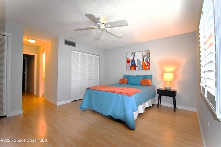 Available for the Season! No monthly rental. Welcome to Paradise! This gorgeous two bedroom, two and a half bath condo is tastefully updated and just a two minute walk to Paradise Beach (aka the local's beach). Featuring an updated kitchen with LED lighting, quartz countertops, white cabinets, tile back splash & floors. impact rated windows and brand new a/c system, new interior paint, slider blinds, plantation shutters, and plenty of storage space throughout. Both bedrooms are spacious, with private full baths & walk-in shower in master suite. Enjoy sunshine, surfing, & great rocket launch viewing, walk to restaurants, and shopping. Sip your coffee in the morning on your privare porch overlooking the beautifully maintained pool. From tennis courts, sauna and a shuffleboard court, activities abound. Offered turn-key furnished, bring your toothbrush and immediately begin to enjoy all that Florida beach life has to offe