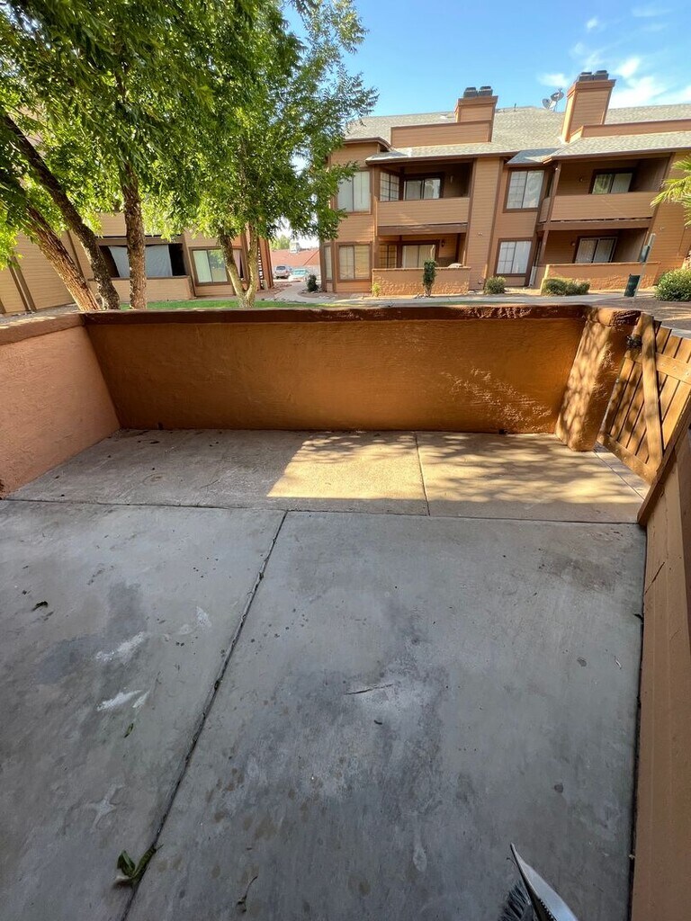 Ready for immediate move in! This charming, three bedroom two bath is just waiting for you! Wood laminate flooring throughout. Living room with fireplace. Kitchen comes complete with stove, dishwasher and refrigerator. There is a countertop microwave along the buffet sideboard. The guest bathroom has a tub shower combo and the master bath has a walk-in shower. 3res bedroom/den does not have a closet. Stacked washer and dryer are in the hall hideaway! The back patio is perfect for relaxing as it will stay shaded most of the day. Water is filled at $55 per month. Tennant connects Electric. Schedule to see this charming condo today!