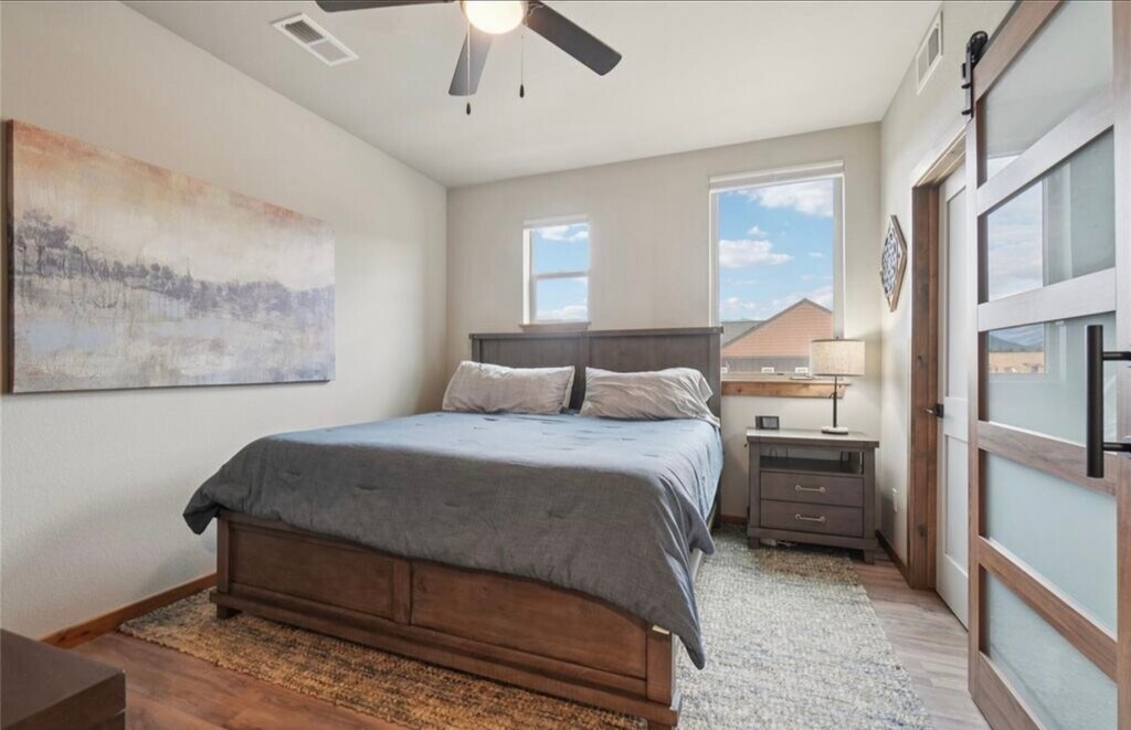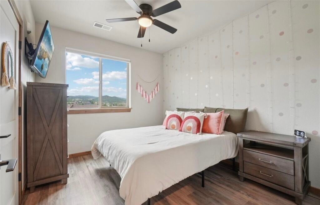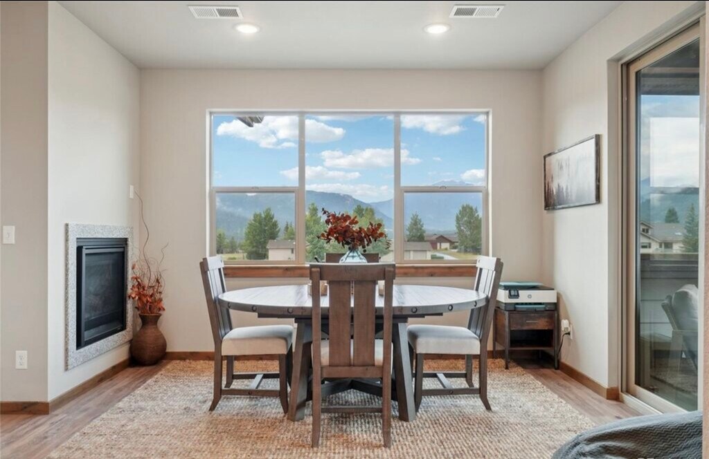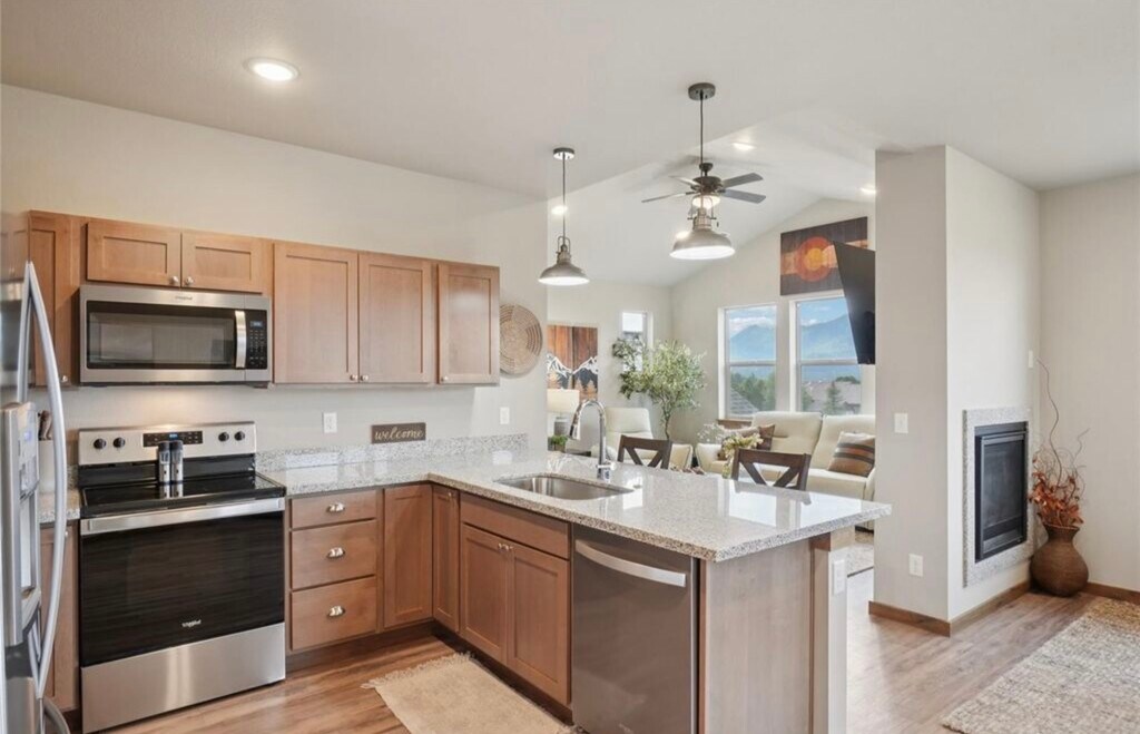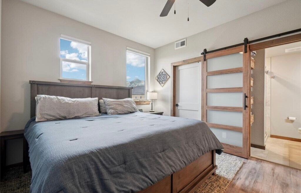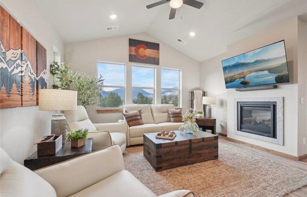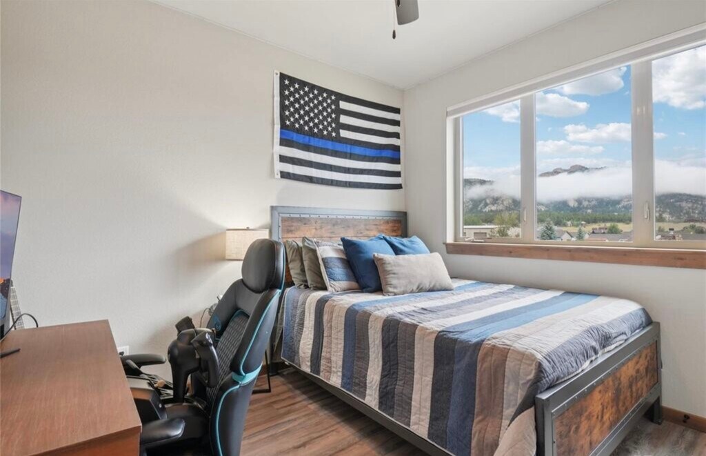3 bedroom, 2 bathroom condo available for rent. Front row views of Rocky Mountain National Park set the stage for this spacious three-bedroom condo in Estes Park’s workforce housing program. Perched on the top floor, this home offers sweeping, unobstructed vistas of the Lumpy Ridge Mountain Range to the north and the Twin Sisters Mountain Range to the south, with mountain beauty visible from every room. The living and dining rooms share a cozy two-sided fireplace, while the dining room opens to a private balcony ideal for outdoor dining or quiet relaxation. A chef-worthy kitchen provides mountain views from the sink, making everyday tasks a delight. The primary retreat includes a walk-in closet and en-suite bath, while two additional bedrooms provide comfortable space for family or guests. An expanded laundry room adds additional space and includes a stackable washer and dryer. Recent upgrades include central air conditioning, a barn door for the primary suite, a glass shower door in the primary bath, and enhanced single stall garage with storage and upgraded flooring as well as an additional storage cage. Easy-maintenance LVP flooring runs throughout the living spaces, blending style with practicality. This quiet community offers unmatched convenience, with Lake Estes just steps away for fishing, paddle boarding, kayaking, and scenic hikes, while downtown Estes Park’s shops, dining, and entertainment are just a short stroll away. $2,700 a month plus utilities, 9 month minimum. Buyers must work 30 or more hours per week within the Estes Valley R3 School District boundaries. DM for additional details.