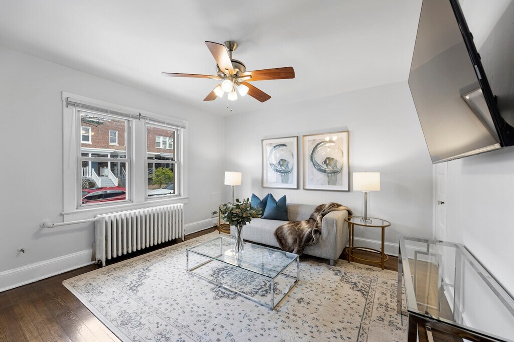 The advertised rate of $2,649/month is the lowest available price, based on a 1 month(s) stay with a move-in date of November 4, 2027. Rates vary depending on the duration of stay, season, and other parameters. For exact pricing and additional pricing components, please visit our website and enter your desired move-in and move-out dates. The rate is applicable when billed upfront; it can be higher if billed in multiple payments. Feel at home in this complete 2-bedroom apartment centrally located in the heart of DC. This apartment offers a cozy living room and gleaming hardwood floors. This apartment features Wi-Fi and flat-screen TVs. The kitchen is available for your use. Free private parking is available. This apartment is centrally located in the historic riverside neighborhood of Anacostia, Washington, DC, a short distance to anything around town, Maryland, and Virginia. It's a 20-minute walk to the green line metro station and a 10-minute drive to downtown DC, MD, and VA. You'll find Busboys n Poets, a juice bar, and other spots within a 5-minute walk. A beautiful park and bike trail with rental bikes are located down the street. Anacostia Metro Station is 0.9 mi/6 min away by car, Capitol Hill is 1.9 mi/10 min, the Washington Monument is 4 mi/13 min, the National Mall is 2.9 mi/11 min, Nationals Park Baseball Stadium is 1.9 mi/7 min, the Smithsonian National Museum of Natural History is 2.9 mi/10 min, and Downtown Washington, DC is 4.1 mi/17 min. No candles, unregistered guests, eating or drinking in the bedrooms, or parties or events are allowed. Smoking is not allowed. Guests will be asked to pay to repair any scratches incurred for not carrying all luggage. Please take off your shoes and leave them at the door. Please turn off all lights and the AC when you leave. [SI]