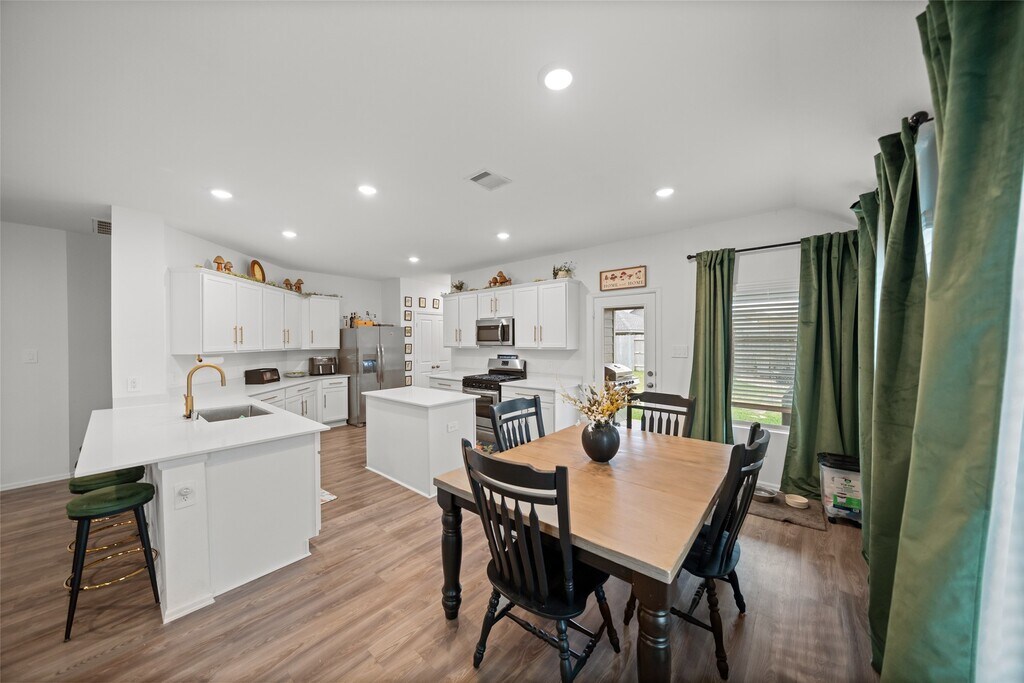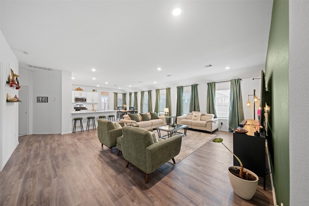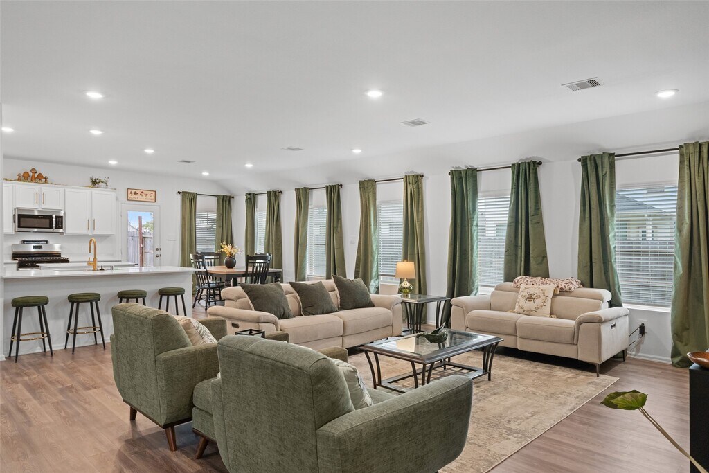 Beautifully built home in 2023,one-story home located on a cul-de-sac in Hockley’s Dellrose community with excellent access to 290 and 99. This 3-bed,2-bath plus study (can be a 4th bedroom) features an open floor plan with wood-look plank flooring,blinds,upgraded selections,and fresh accent-wall paint. The island kitchen offers 36" designer cabinets,new hardware,gorgeous countertops,tile backsplash,breakfast bar,5-burner gas range,refrigerator,and an oversized pantry. The spacious primary suite includes a walk-in shower and dual closets,with one closet offering direct access to the utility room off the kitchen. Enjoy the extended covered patio,the added backyard seating area with fire pit space. Washer,dryer,refrigerator,tankless water heater,and sprinkler system all included. Animal-friendly. MLS# 10854476
