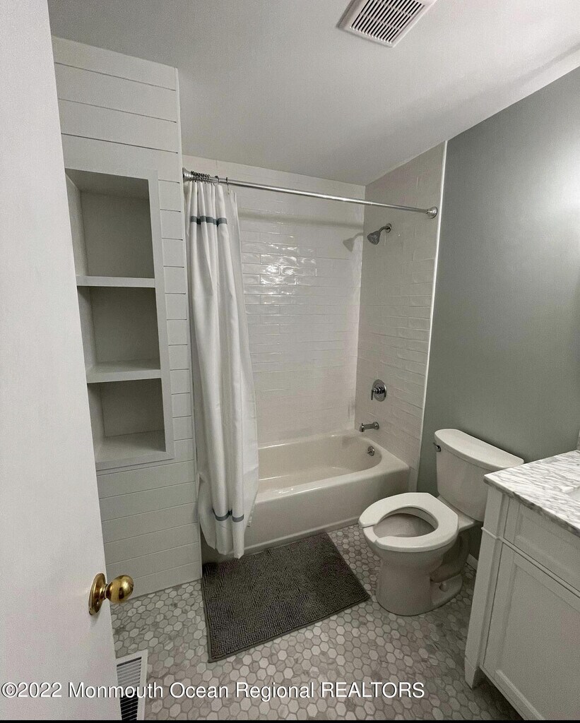 Renovated,modern 3 bedroom,2 full bath annual rental just two blocks to Belmar beach. Kitchen with granite countertops and stainless appliances including dishwasher. 3rd floor is solely for main bedroom with cathedral ceilings. Includes washer/dryer,private backyard patio,and off street parking in driveway exclusive to this unit. Apartment comes with outdoor furniture. No pets,no smoking.