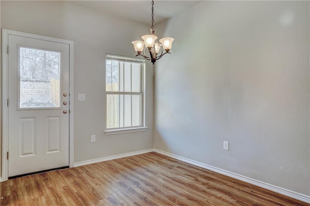 Two-story duplex. 3 bedrooms, 2.5 bathrooms and attached 2 car garage in the heart of Georgetown. Wood style vinyl flooring throughout main level and upstairs. The only carpet is on the stairs for added sound proofing. Open and bright floor plan. Kitchen features granite countertops, black appliances, pantry and plenty of cabinets for storage. Primary bedroom features on-suite bath, two closets, and ceiling fan. Modern style doors throughout, recessed lighting, private backyard, and laundry room located upstairs for convenience. Minutes to the famous Georgetown Square and Southwestern University. MLS ID 5428248