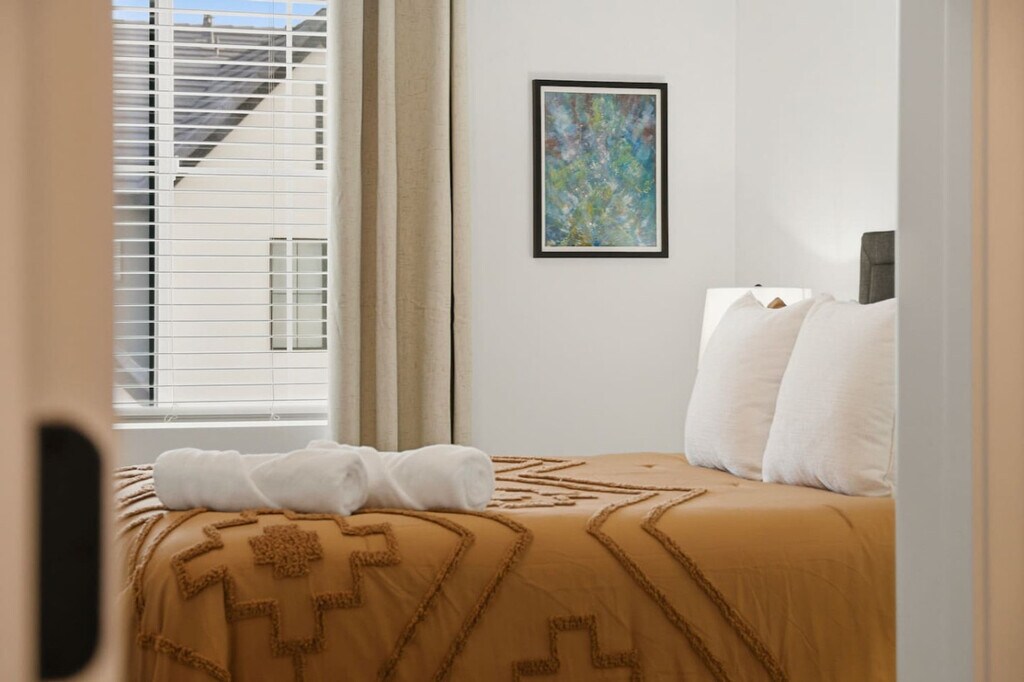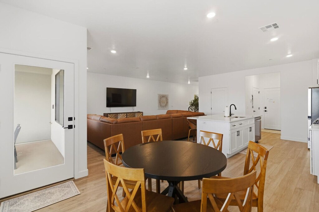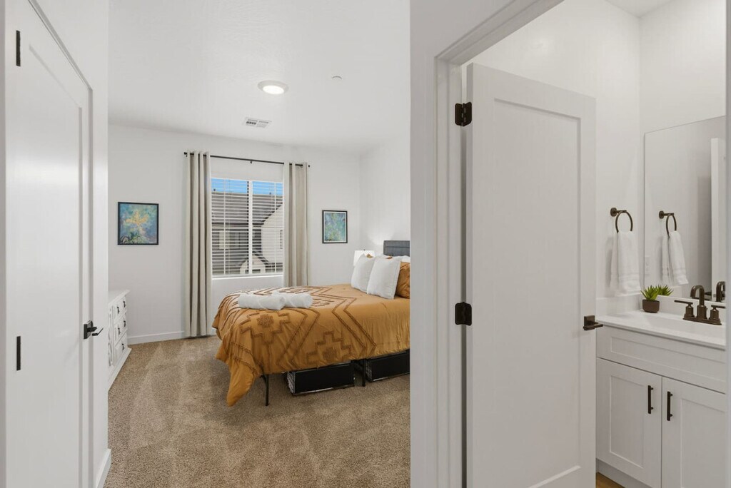 Feel at home in this comfortable Southern Utah home base, perfect for families, friends, and group adventures. All bedrooms are located upstairs, each offering a private full bathroom and 55” TV. Downstairs is all about connection, with a bright living room, fully equipped kitchen, and dining area made for shared meals and conversations. The main floor features an open-concept living room with a 75” TV, a fully equipped kitchen, a dining area, a half bath, and access to the garage and backyard. The upper level features all four bedrooms with private bathrooms, a cozy secondary lounge, and a full laundry room for longer stays. Enjoy a small backyard ideal for fresh air and quiet moments. Community amenities include a resort-style pool with loungers, pickleball courts, a game room, and cornhole and outdoor ping pong. Parking is available for 2 cars in the driveway and 2 cars in the garage. Overflow parking is available in designated community lots. Zion National Park is approximately 39 miles away. Community amenities are just a short walk away, including walking paths and shared spaces. Daytime construction noise may be present nearby, approximately 8:00 AM–5:00 PM. No street parking is allowed. No smoking or vaping is allowed on the premises, and a $200 per day fee will be assessed for each day of the reservation if it is found that guests have been smoking or vaping on the premises. If the property is pet-friendly, pets are allowed at the property at the cost of $10 per pet per day. Emotional support animals fall under this requirement as they do not have the same rights as service animals under the Americans with Disabilities Act (ADA). If the property is not pet-friendly, no animals are permitted at the property. Service animals are permitted at all properties at no extra cost, as they are protected under the ADA, as long as accommodations are reasonable. Guests are required to pick up after their animal and will be charged $10 per exterior location if not cleaned up by the guest. If animals defecate or urinate on the floors, the guest will be responsible for payment for professional carpet cleaning services. If animals cause damage to the property, the guest will be responsible for paying for any repairs or replacement. For unauthorized pets, a $250 fee will be assessed. Quiet hours begin at 10:00 PM each night and continue until sunrise. Quiet hours consist of keeping all audio and noise levels at a minimum level out of respect for the surrounding residents. Moving furniture is not allowed, and a $500 fee will be assessed if the cleaners have to move furniture to reset the property for the next guest. Please note that the garage space is occasionally accessed by the ownership team for storage purposes. Guests may hear brief activity from the garage area at times. This access is separate from the home, and there is no interior access from the garage to the guest living spaces. Guests have full, private use of the home, and the garage activity does not affect interior privacy or access. [SI]