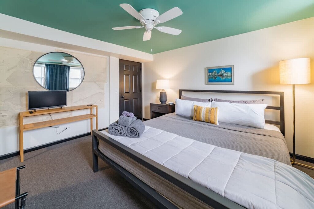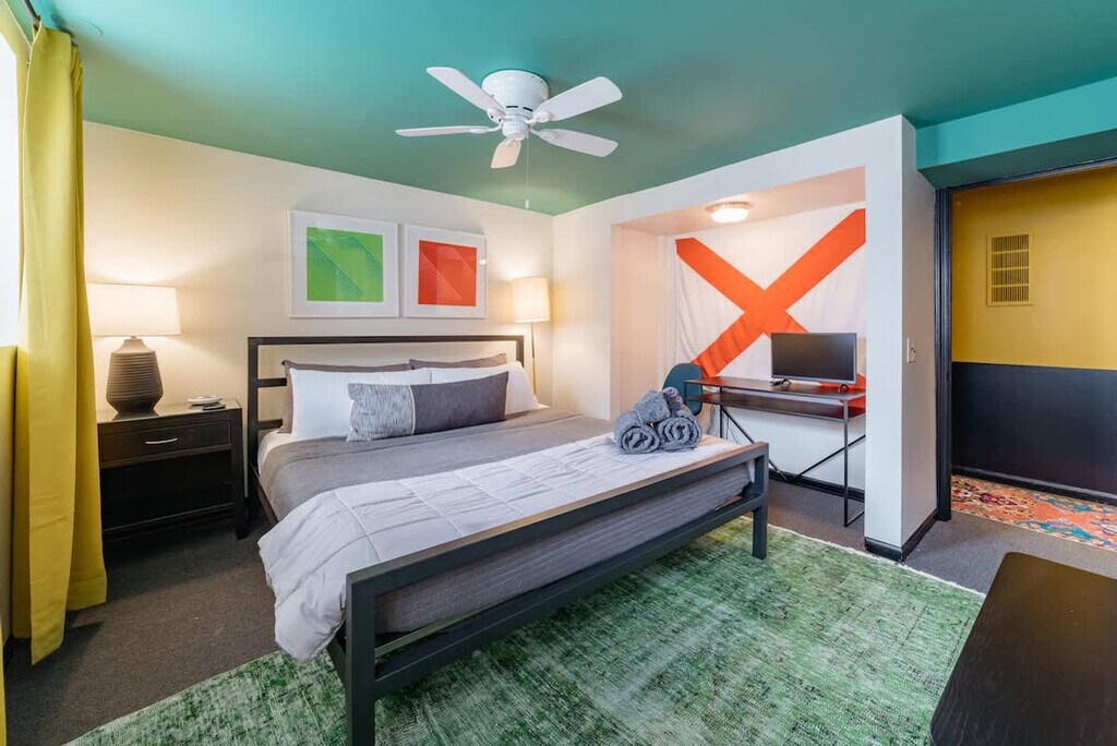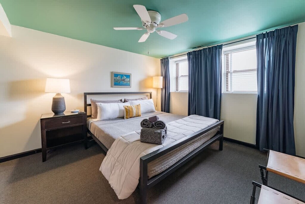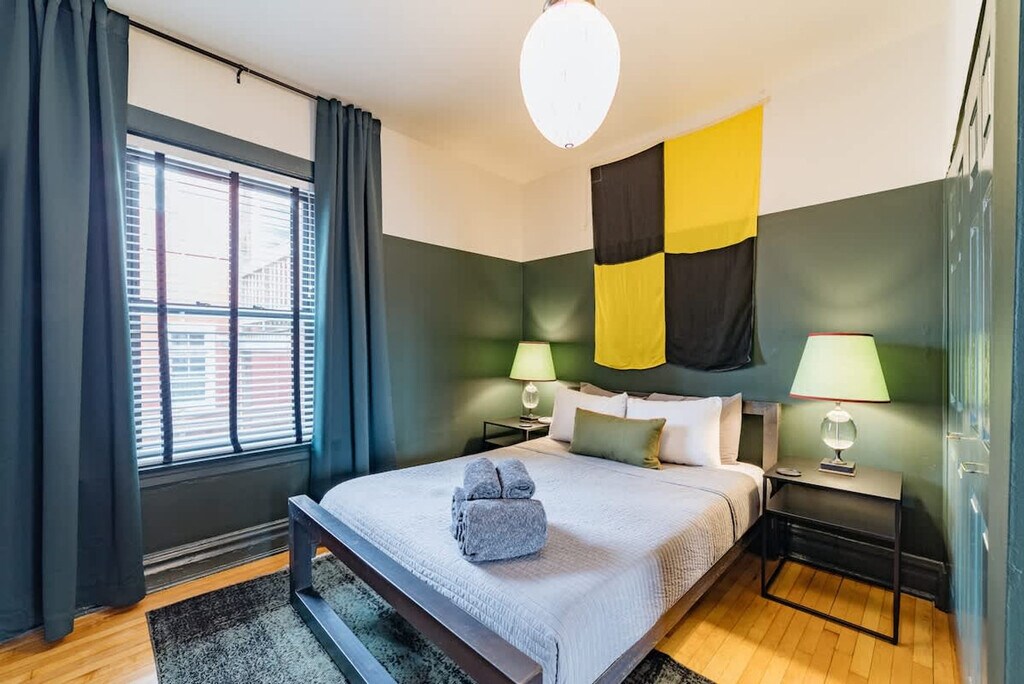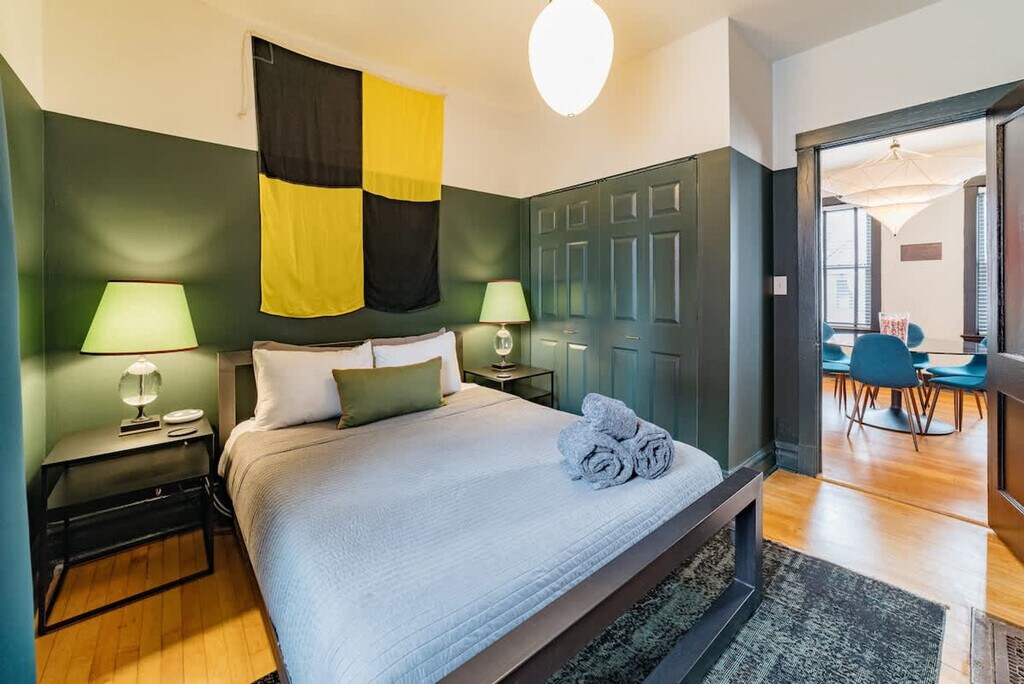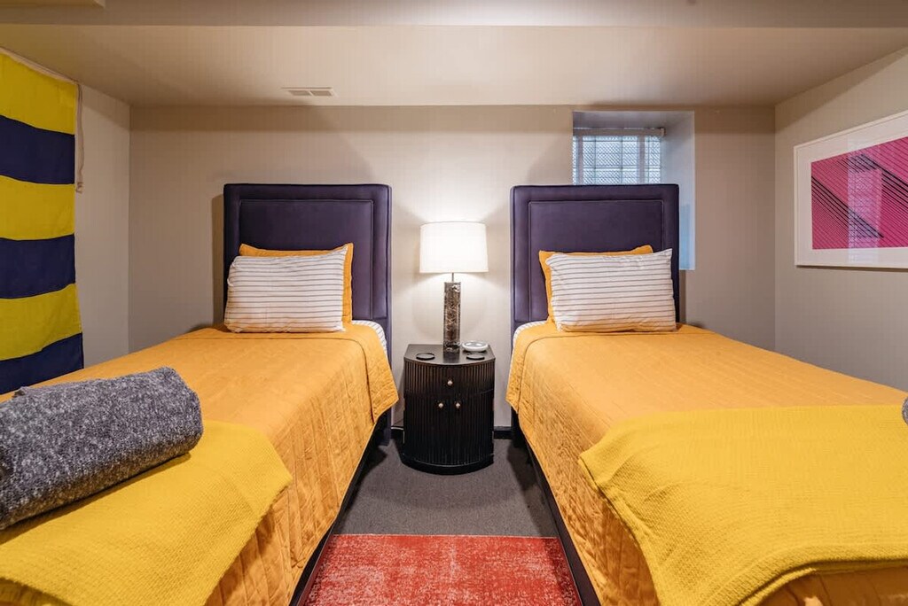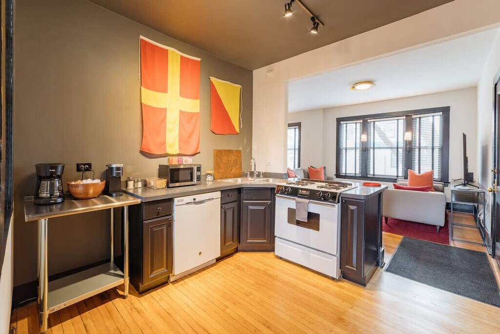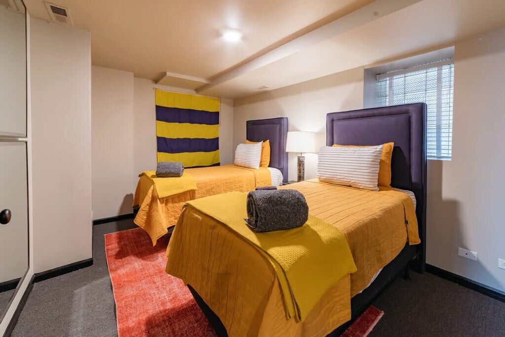 Feel at home in this unique apartment, set-up with all the comforts of home while embracing the quirky charm that only a vintage building can offer. Super easy access to Wrigley Field, the bustling Southport shopping corridor, and all of the 'Boystown' nightlife. The apartment includes high thread count cotton sheets on the bed, comfortable feather pillows, great mattresses, and thick towels. The bath products are from Public Goods. The full kitchen includes a Keurig and coffee maker with coffee. Apartment areas include an upstairs living room, dining area, full kitchen with breakfast counter, bedroom #1 with queen bed, full bathroom #1, and a downstairs bedroom #2 with king bed, bedroom #3 with king bed, bedroom #4 with 2 single beds, and full bathroom #2. One free parking spot is included with your stay. If you'll bring more than one car, there's free street parking on the block and most residential blocks nearby except between 5-10pm on Cubs game nights and when there are special events at Wrigley Field. It is recommended to use a service called SpotHero to reserve a spot nearby before you arrive. Local highlights within 15 minutes include Wrigley Field & Wrigleyville, Southport Corridor, Music Box Theater, Metro Theatre, Boystown, Lakefront Trail & Belmont Harbor, and Lincoln Park Zoo. The Addison 'L' train stop (Brown line) is a 6-min walk. O'Hare is 50 min via public transit or ~35 min drive, and Midway is 60 min via public transit or ~45 min drive. This apartment is located in a vintage urban building, so you may occasionally find an errant cobweb or two on the lower level. Quiet hours are from 10 PM to 8 AM. There is an automatic $100 late check-out charge if you're still in the property 20 minutes after check-out. There is a $45 fee if you lock yourself out or lose your key. [SI]