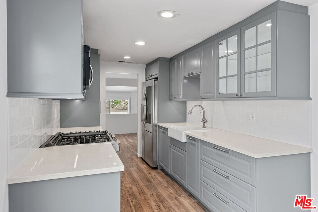 Largely untouched by the recent fires, this rapidly repopulating area of The Highlands is quickly becoming an ideal retreat for those re entering schools, homeowners overseeing their rebuilding efforts or anyone seeking a quiet restpite. As the Palisades community focuses on rebuilding this exquisite end unit" with only one shared wall serves as a sanctuary of privacy and tranquility. Nestled at the serene back edge of the property, this unique rental features two bedrooms / two baths and a versatile third room that can be used as an additional bedroom, office or den catering to your specific needs. The primary bedroom offers soaring cathedral ceilings, generous closet space and spacious walk-in closet, while the hallway offers even more ample cabinet storage. The second bedroom is clean and comfortable with its own closet for all your belongings. Designed with entertaining in mind, the spacious living room with a flat screen tv pony wall features a cozy gas fireplace that seamlessly flows out to a very private brick patio perfect for socializing and relaxation. A few steps up lead you to the inviting dining area, which is served by an adjacent fully remodeled kitchen showcasing stainless steel appliances, ample counter space and intimate breakfast area framed by a picture window with state park mountain views. The entire home is kept at perfect temperature with a Nest Thermostat for heating and cooling. On the lower level, you'll find a dedicated laundry area equipped with washer and dryer, along with convenient direct access to an oversized two-car garage featuring extensive wall cabinets ideal for storing your golf clubs, bikes, snowboards, surfboards and more. Convenient off-street guest parking is also readily available. Comforting add ons are a sparkling pool, spa, sauna, gym and relaxing grassy play area. Just moments away from fantastic hiking, mountain biking, beaches and The Palisades Village this property is a wonderful interim or long-term lease option in a revitalized location close to everything you desire. This home has been remediated inside and out. The attic and crawl space has been cleaned and the insulation replaced. Exterior common grounds power washed. Listing photos are virtually staged." MLS# 25617997