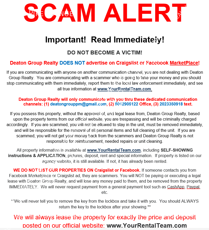 *$0 Deposit Option Available - Please read the full description.* All information about this property is available at YourRentalTeam dot com on the rentals tab, including application. These properties are available for self-showings only by going to *Rent: $750.00 *Deposit: $0 This unit provides a deposit-free option with Obligo's FolioGuard. Residents can use FolioGuard to skip their security deposit and save cash. Moving is expensive, this can help you save on upfront costs. Tenant can also choose to pay a deposit if they don't want, or not approved for, the FolioGuard deposit alternative policy. Cash security deposits are eligible for refund upon vacating the home, less deductions for damages, unpaid rent or other charges, in each case subject to applicable law. *Application Fee: $50 (for each tenant 18 and older). *Pet Fee: $450 nonrefundable deposit plus $25 monthly, per pet. Pets allowed up to 25 lbs each. *Tenant responsible for all utilities. *Smoking is not allowed anywhere in/on the complex. *Food Service SERVER employment will not be considered toward monthly income requirements. *Renter's insurance required by tenant. *Current employment for a minimum of 12 months, unless moving to the area. *500 minimum credit score. *Applicants should have a gross "take-home" household monthly income equal to or greater than 3X the monthly rent. *Housing subsidy accepted *2 year minimum lease All information available at YourRentalTeam dot com on the rentals tab. If property is listed on our agency website, it is still available. If not, it has already been rented. Application to be completed at YourRentalTeam dot com only. Welcome home to 1712 Pike in North Little Rock. Recently updated home, sitting convenient to all Little Rock and North Little Rock amenities. Updated flooring and paint. 3 bedrooms, plus dining room room, large living room and large laundry room with washer/dryer hook ups. Pets allowed with pet fee. Use alley behind property to park and access home. All information available at YourRentalTeam dot com on the rentals tab. If property is listed on our agency website, it is still available. If not, it has already been rented. Application to be completed at YourRentalTeam dot com only. Maintenance requests are being handled quickly, and tenants have an online portal to submit maintenance requests, and to pay rent via ACH or Credit/debit card. This property available for self showings by visiting Your Rental Team dot com on the rentals tab. All details, including showing instructions, pictures and application available at Your Rental Team dot com on the rentals tab. This property allows self showings. Additional inquiries may be directed to . Attention All Potential Renters! ***Beware of Scammers!*** Consider the following points: (1) the ONLY site for up-to-date information on the property, instructions on how to view the property and apply for the property is at our company website, Your Rental Team dot com, on the rentals tab. (2) Only Deaton Group Realty acts as the Property Manager for this property and ONLY we are responsible to lease it. The owner(s) will not seek to lease the house on their own. If someone contacts you claiming to be the owner, they are trying to steal your money and/or personal information. (3) WE WILL NOT LIST OUR PROPERTIES ON Craigslist or Facebook. If someone contacts you from Facebook Marketplace or Craigslist, they are scammers. You will not be executing a legal lease with Deaton Group Realty, and will lose any money paid to them, and be removed from the property. They are going to steal your money and/or personal information. All payments requested from Deaton Group Realty, will be provided a secure link to pay online via our Appfolio software tool. We will never request payment from a general payment tool such as CashApp, Paypal, etc. (4) All future residents 18 or older must apply and meet our application criteria posted on our official Your Rental Team website. (5) We will always lease the property for exactly the price and deposit posted on our official Your Rental Team website. We do not accept Zillow applications. All applications have to be submitted through us. Please verify all the information listed above with the appropriate authority at . To report issues or to obtain additional inquiries, email to . If you notice any habitability or safety concerns in this property, please let us know. Reach out to us with photos via e-mail. Additional information about FolioGuard: 1. After your application has been approved for occupancy, you will have the option of paying a cash deposit or using Obligo's deposit insurance, FolioGuard. Upon application approval, we will send you a portal activation link. Tenants who want to sign up for the service can do so within their portal and be approved within minutes. 2. Tenant completes the qualification process in their online portal. 3. Qualified tenants can choose whether to pay a cash deposit by exiting out of the Obligo/FolioGuard service option or keep the money in pocket by signing up for this alternative deposit service. 4. If tenants who sign up cause damages or owe unpaid charges, management may be reimbursed up to the full deposit amount at move out from the FolioGuard alternative policy. 5. Deposit insurance is payable with a monthly service fee, all billed up-front for the first year. 6. The deposit alternative amount will be up to 1.5 times monthly rent.