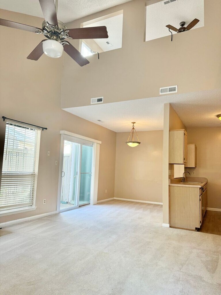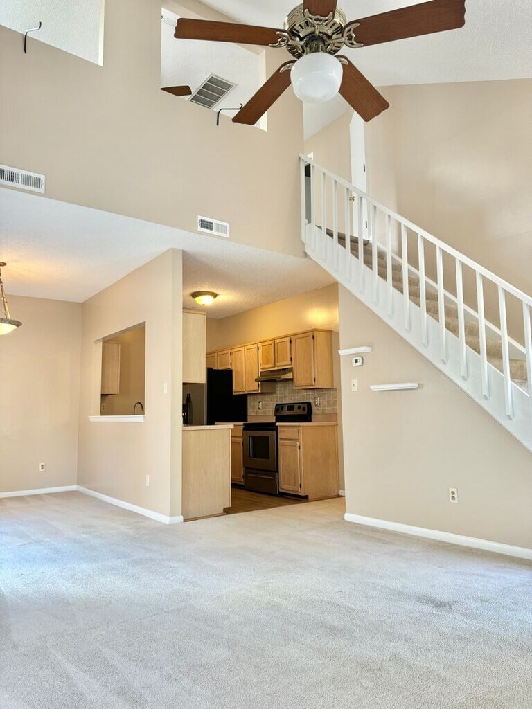 Incredible natural light inthe wide open floor plan with high ceilings, gas fireplace and sliding glass doors that open to private patio area. First floor bedroom and bathroom plus a loft and second bedroom and bathroom on the 2nd floor. Walk in closet, jetted tub, stainless steel appliances, and water is included in rent! Apply at application fee is $60 per adult.