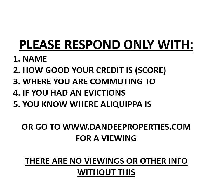 Property Id: 2390992 NO PHONE CALLS OR TEXTS-please respond with: * phone number . Name * email address, and a good time to call. * where you are commuting to and that you know where Aliquippa is * How good your credit is..No prior Evictions OR GOTO: PLEASE RESPOND ONLY-WITH DATA ASKED FOR ____________________________________________ No neighbors across the street. Tranquility at it's finest, this is an apartment, shared with a solo structure on 2 acres.. NO PETS!!! * DO THE MATH ON WHAT'S INCLUDED: INTERNET ($100) Cable ($100) WATER ($35) Electricity ($75) $310 VALUE YOU WILL NOT FIND A BETTER VALUE, ON An apartment THIS NICE, with a garage, washer & dryer. An address to be proud of. A Secluded area, but still has quick access to the Airport (14 minutes) NON smoking, large , This is a unique property. Half is in Aliquippa, Half is in Hopewell. Convenient access to Brodhead Rd & 376 (old route 60) VIEWING IS BY APPOINTMENT ONLY! * WIFI, High speed cable modem & Your own wireless router (Performance grade 800 mbps), * Cable TV platinum package (all premium channels) included * Includes WIFI, Electric, Cable, Water, Sewage, and Refuse service * Washer & Dryer * Large deck * Stainless steel appliances (gas range) * Central A/C * High Efficiency Gas furnace (96+) * Large Front yard (fully Maintained) * Large Master Bedroom * Large windows * Large closet space * Smoke/Carbon Monoxide Detectors centrally wired * On demand gas water heater (endless showers) * Off street Parking-Garage heated * Access of over 35 acres of secluded property, creeks, hiking, and wildlife *A heated garage with an electric opener is available for and additional $50 THESE utilities are included, (Electric, Water, sewage, refuse, WIFI & Cable NO PETS! No exceptions Unfortunately this is NOT section 8 compatible (and the price is too high?). Security deposit of one month required. Viewing is by appointment only, Criminal and credit check