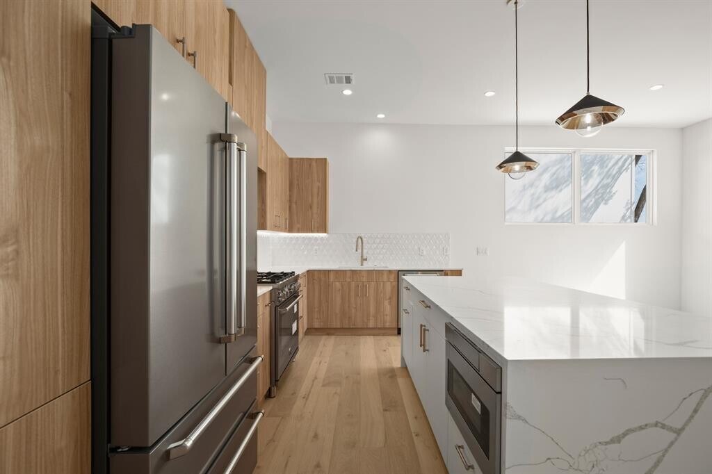 Modern home in East Austin, just 10 minutes from Downtown and 5 minutes from popular shopping, dining, and entertainment on the east side. The thoughtfully designed open floor plan featured high-end fixtures, wood floors, and an abundance of natural light. Perfect for entertaining, the living room seamlessly blends into the kitchen and dining area. A chef's dream, the kitchen features a center island with quartz waterfall countertop, custom cabinets, and Bertazonni appliances. Retreating to the primary suite, you will find a spacious, private retreat with a luxurious en suite featuring a double vanity, glass-framed walk-in shower, and walk-in closet. Two additional well-appointed bedrooms share a bathroom with modern fixtures and ample counter and cabinet space. On the third floor, a large flex space is perfect for your home office, home gym, or game room. A side yard and the fully fenced-in front yard provide ample outdoor space for gardening, barbecuing, or just relaxing on a warm day. Motorized gate encloses the driveway and front yard for privacy.