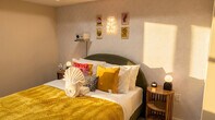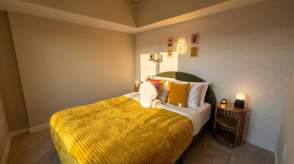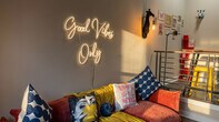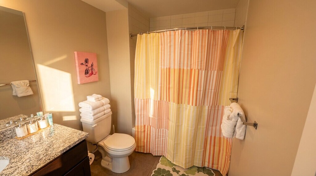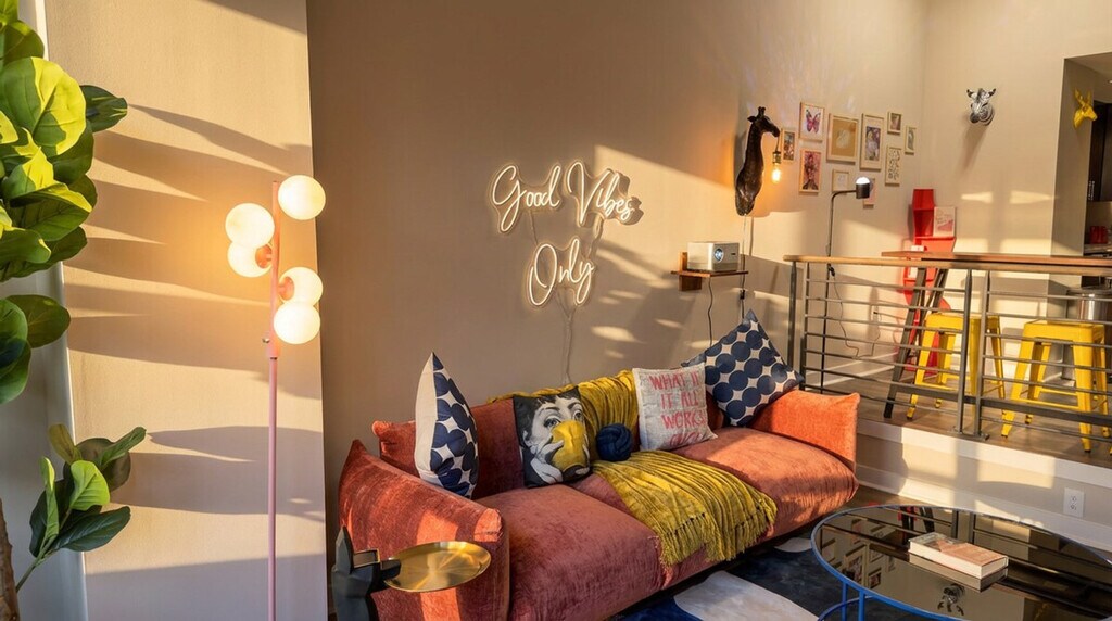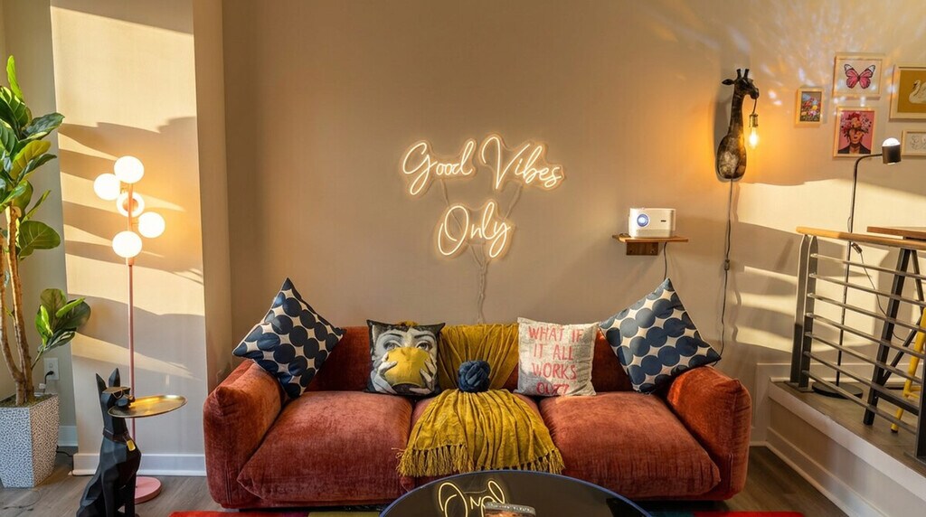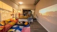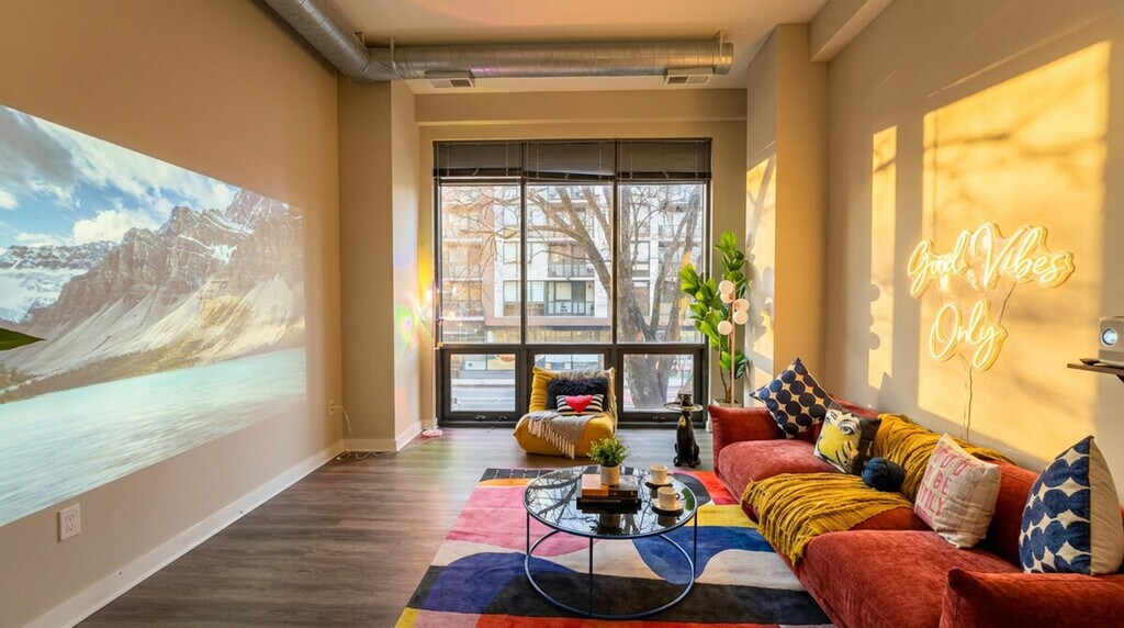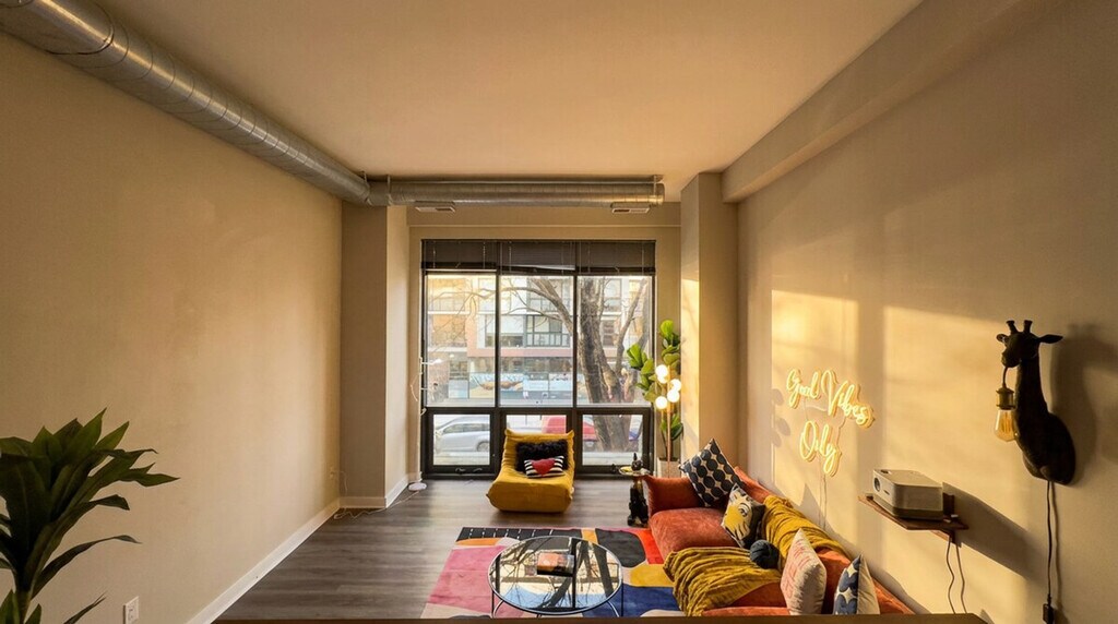 Feel at home in this vibrant 2-bedroom, 2-bath loft in the heart of Shaw, DC. This apartment features high ceilings and lots of light. The apartment includes a massive projector in the living room, with movies already loaded in the bedrooms. The living room even has a skylight right above the projector screen. Plus, there’s a bar area. Pets are welcome for an additional fee. Parking is available in the garage for an extra fee. Please inquire before booking so we can inform you of the applicable fees. While the building might look a bit vintage from the outside, once you step inside, it’s like a whole new world. A quick ID or passport check is required before check-in after booking. [SI]