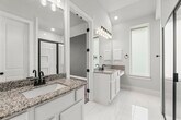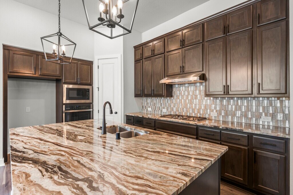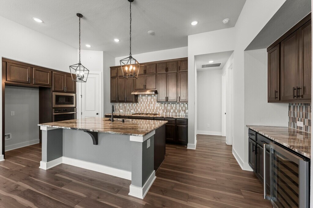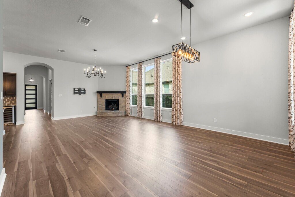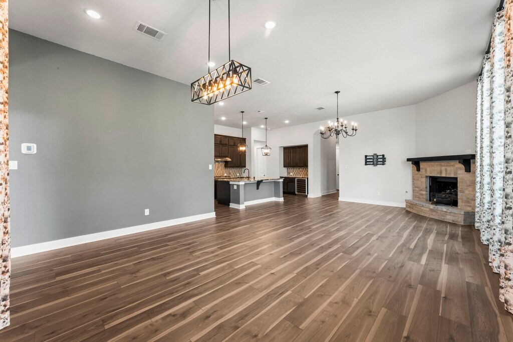 Discover this captivating single-story home,where luxury meets comfort. Inside,rich wood floors flow through the bright,open-concept living area,anchored by a charming brick fireplace,perfect for cozy evenings. Grand windows ensure the space is always bathed in natural light. The gourmet kitchen is a true culinary haven,featuring rich,dark cabinetry,sleek granite countertops,and a massive center island. Built-in appliances and a convenient wine fridge make hosting a breeze! Unwind in the primary suite's spa-inspired bath,offering crisp white finishes,dual vanities,and a stunning walk-in shower with chic black-framed glass. Step out to your own private retreat! The expansive,maintenance-friendly paver patio is designed for fun. Gather friends around the built-in fire pit or host the ultimate BBQ with the dedicated outdoor grilling station. This home offers a lifestyle of effortless luxury waiting for you! MLS# 7526036