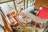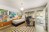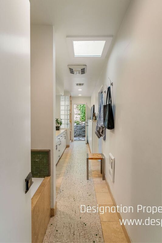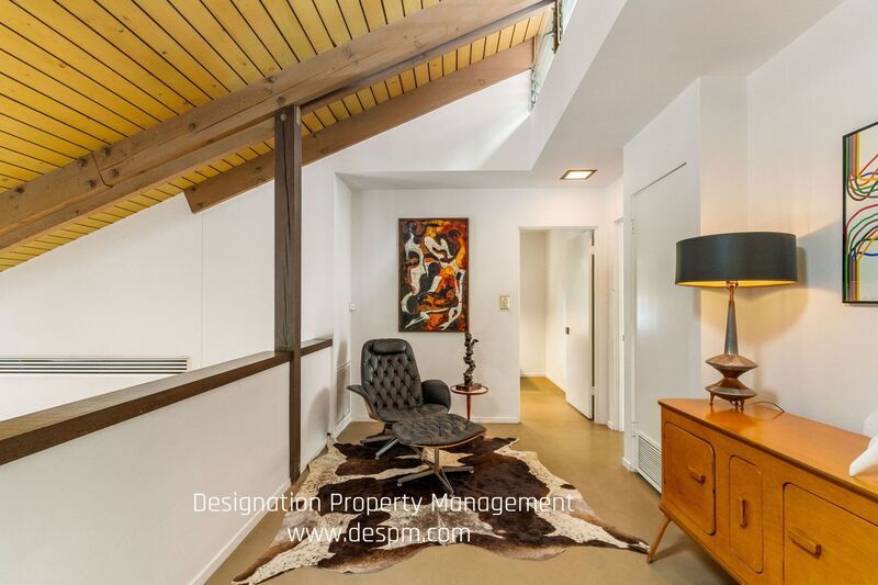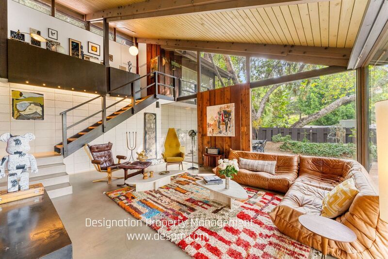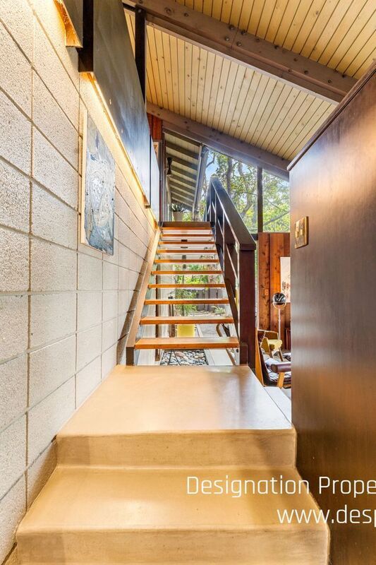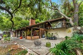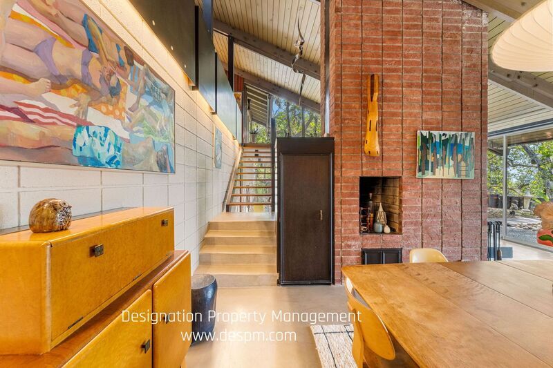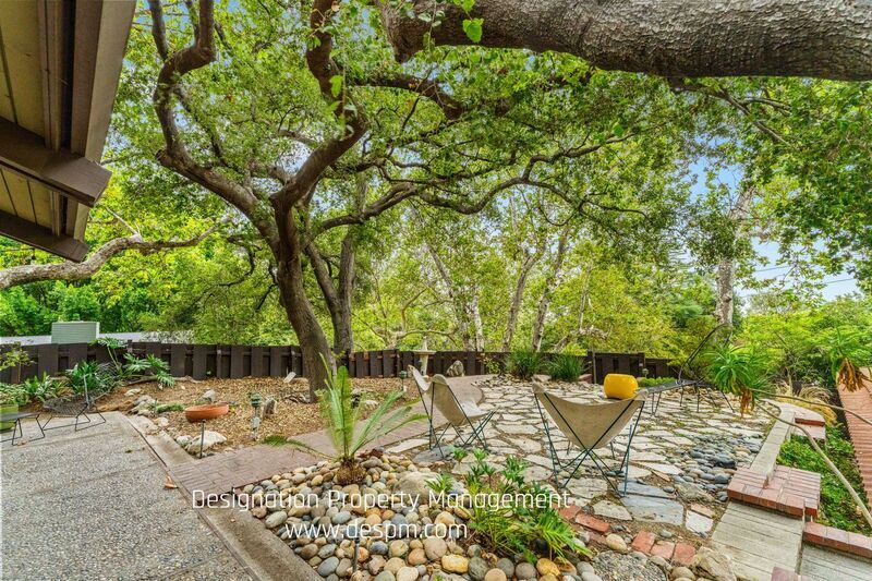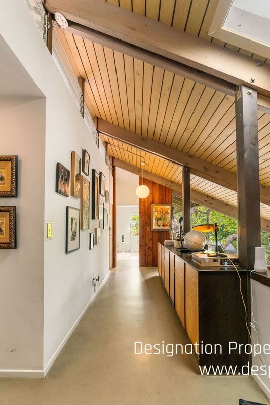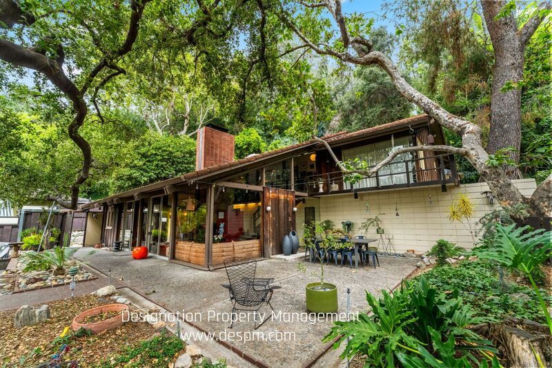 This two-story, A-Frame mid-century style home offers a secluded and intimate environment among Sycamore & Oak trees. Designed by Edward Ted Grenzbach, known as the Architect to the Stars, who created homes for Hollywood notables Frank Sinatra, Rock Hudson and Johnny Carson. His design of wall-to-wall glass sliding doors along the front of the home enable you to see the interior before you walk in the door and provides a seamless feeling between the interior and exterior. The lower level's open floor plan includes the living & dining areas with 17 ft high ceilings, wood beams and a brick floating fireplace. A remodeled kitchen and half bath complete this floor. Upstairs is a spacious loft with the 3 bedrooms & 2 full baths off this corridor. An en-suite principal bedroom has a huge walk-in closet, private office room and lovely balcony with sliding glass doors to enjoy the tree-top views. Jack & Jill bedrooms share an updated bathroom with dual sinks. All three bedrooms have exterior doors to the backyard patio. Study room with closet has fourth bedroom possibility. Private patios on front yard extend your living space and are perfect for entertaining or dining al fresco. Detached garage. Easy access to 210 freeway, Rose Bowl and golf courses. Nearby dining and shopping in Old Town Pasadena and La Canada. DRE 02036099